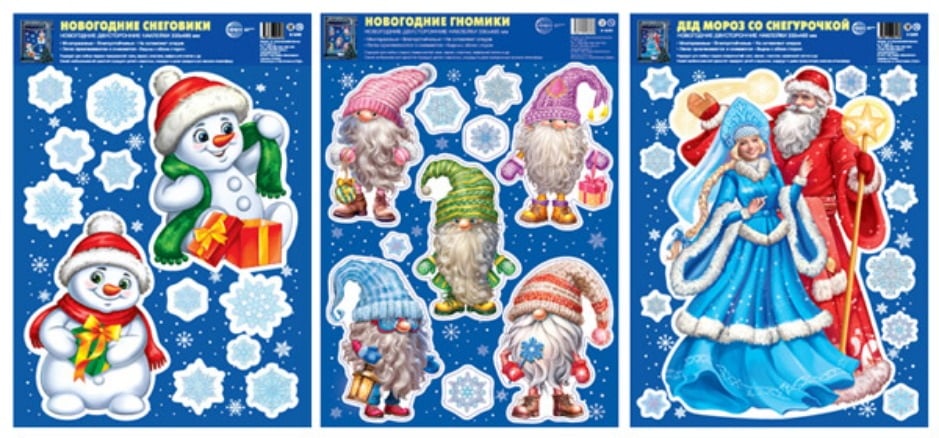Наклейки новогодние на окна в комплекте Дедушка Мороз и его помощники (3 наклейки, многоразовые, видны с обеих сторон), формат А3