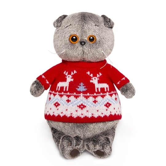 Кот в шикарном свитере с норвежским орнаментом. Белые олени и морозно-голубые ёлочка и полосы украшают перед свитера. Свитер связан из мягкой шерстяной пряжи яркого алого цвета.