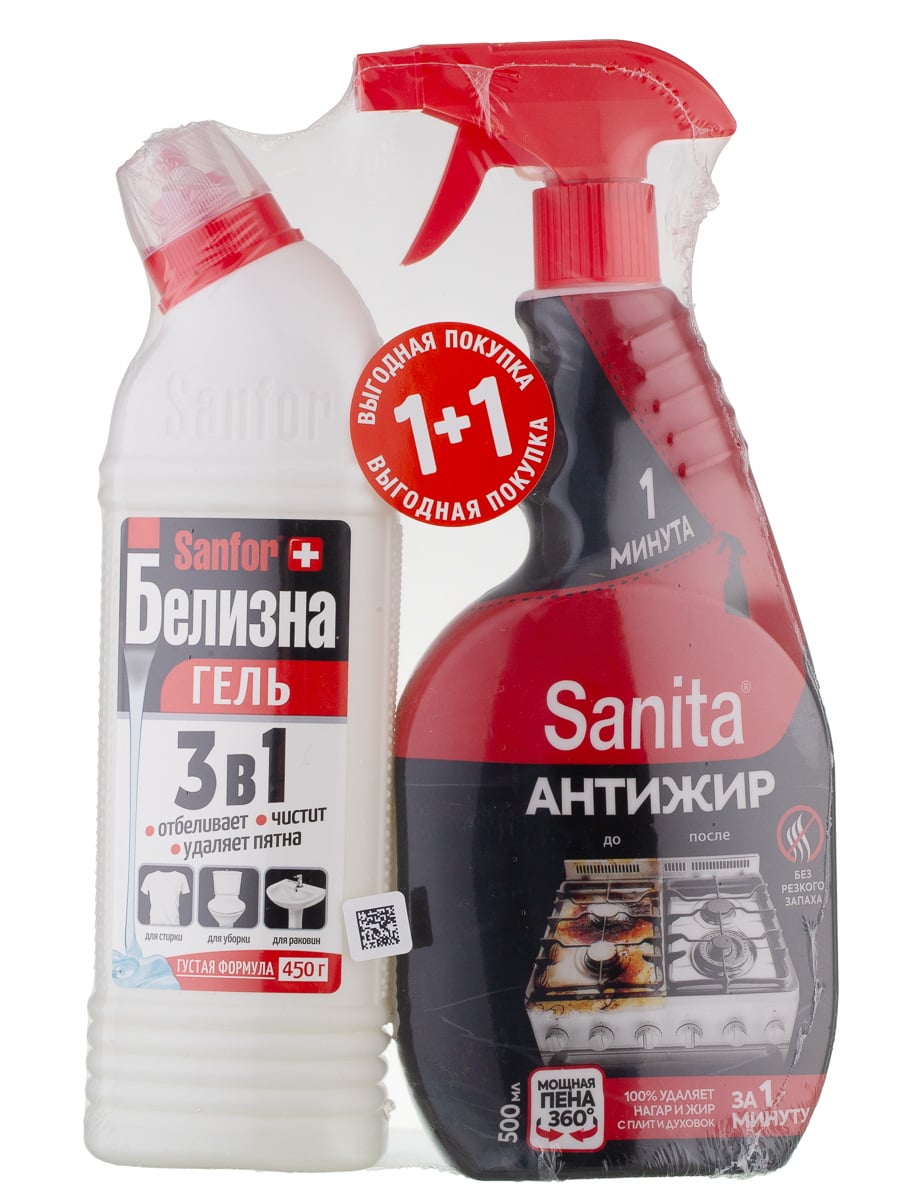 Набор чистящих средств: SANITA Спрей АНТИЖИР 1 минута: Чистящее спрей средство для уборки кухни Sanita Антижир «1 минута» – это универсальное мощное решение, которое поможет вам легко и эффективно очистить различные поверхности в вашей кухне. Благодаря своей мощной формуле быстро и эффективно удаляет жирные пятна, нагар, въевшуюся грязь с любых кухонных поверхностей: плит, микроволновых печей, вытяжек, духовых шкафов. Sanfor Белизна гель, 3в1: Многофункциональное средство комплексного действия (с хлором) с инновационной формулой отбеливания пятен предназначено для отбеливания и удаления пятен перед стиркой, а также дезинфекции и чистки сантехники и труб.Sanfor "Белизна гель" 3 в 1 легко справляется со сложными пятнами, желтизной и загрязнениями, уничтожает микробы и бактерии.Благодаря густой консистенции гель равномерно распределяется, не стекает, экономично расходуется. Флакон оснащен антискользящей поверхностью, его удобно удерживать в руке во время уборки, а также блокиратором крышки для защиты от детей.