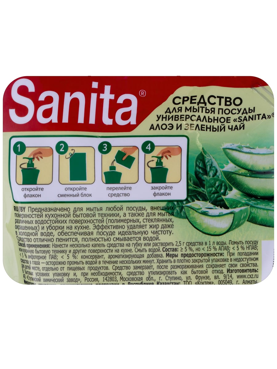 SANITA Средство для мытья посуды "Алоэ и зеленый чай", дой-пак, 900 г