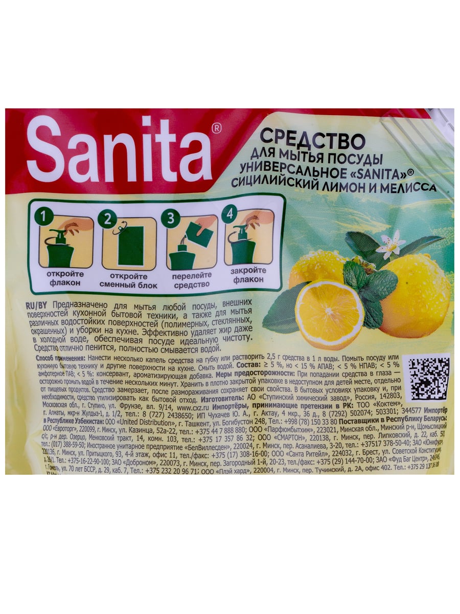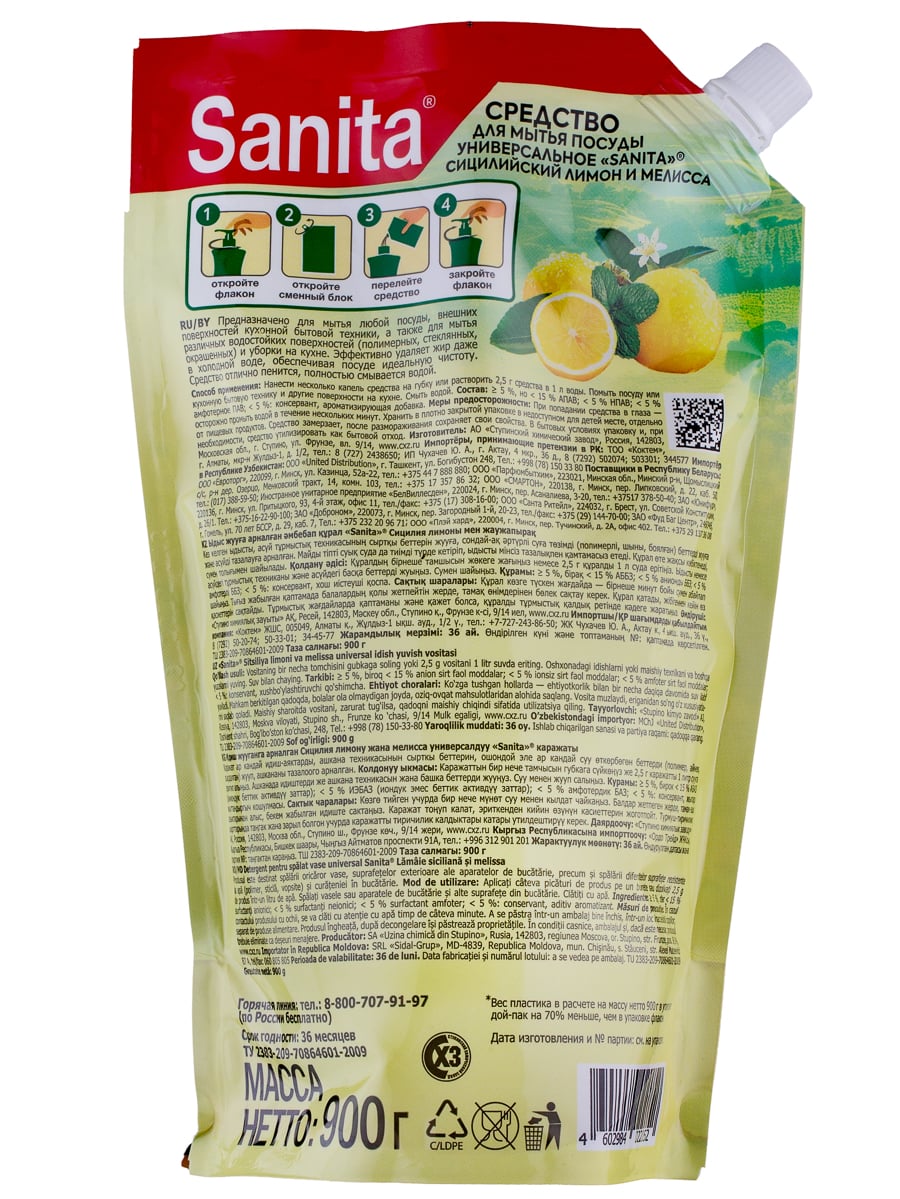 SANITA средство для мытья посуды "Сицилийский лимон и мелисса", дой-пак, 900 г
