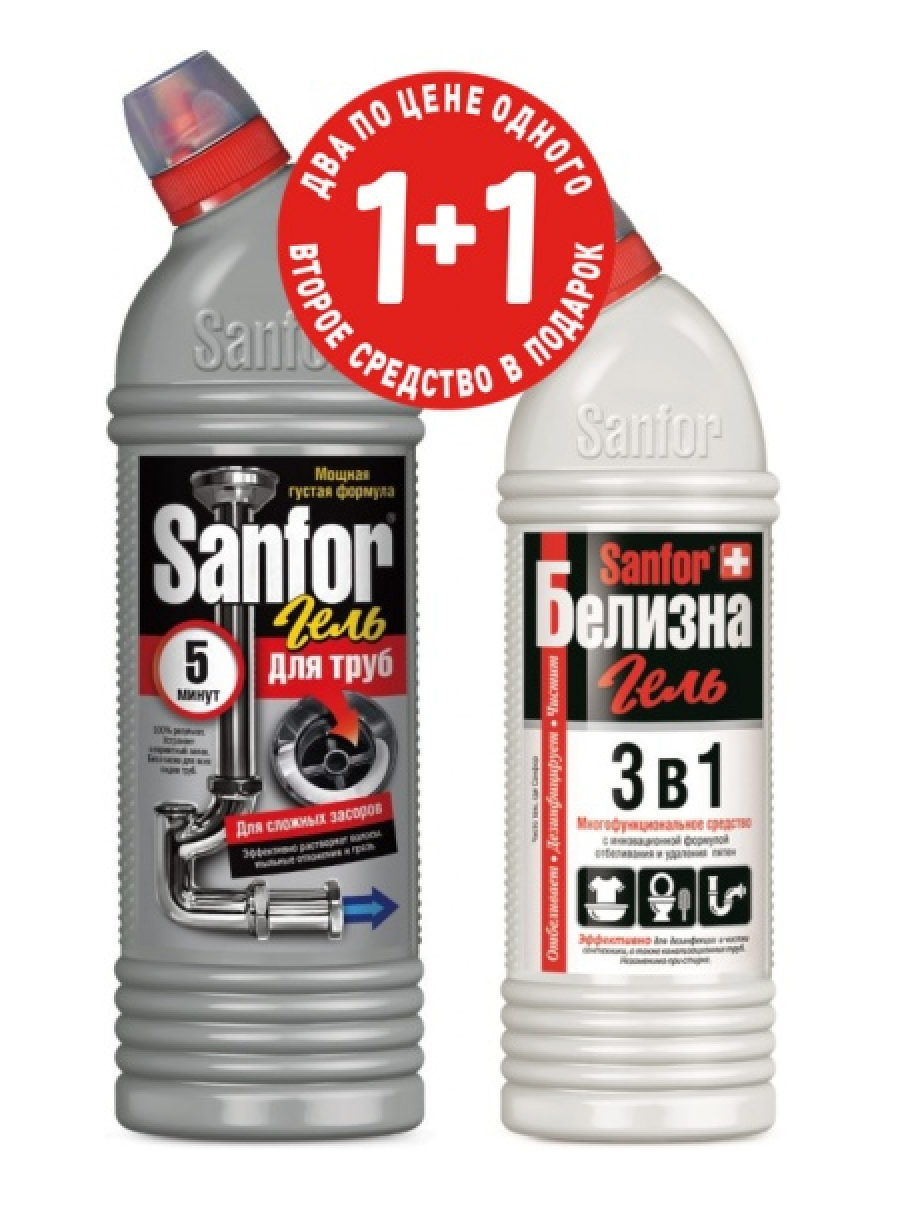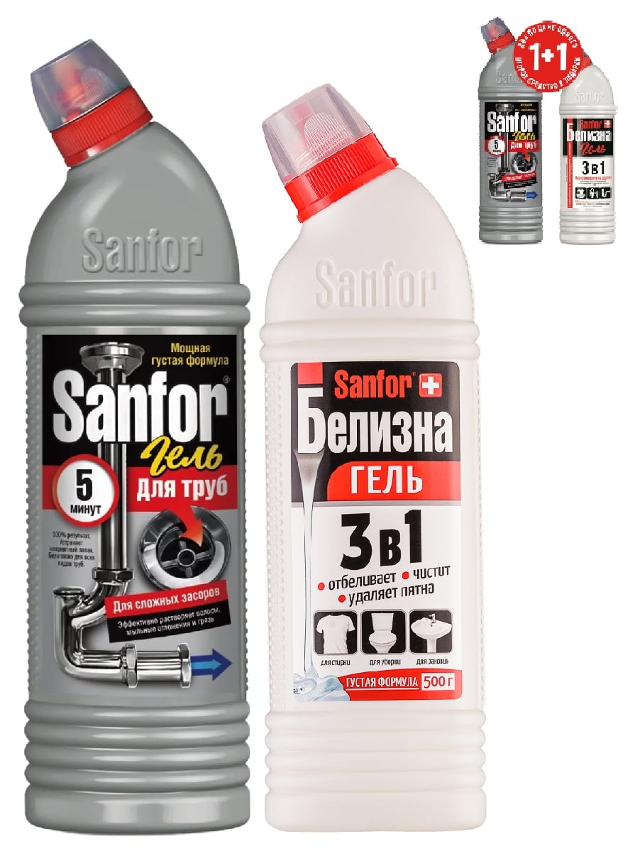 Набор SANFOR Средство для прочистки труб TURBO, 750 г + Белизна гель, 500 г