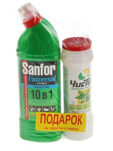 Набор чистящих средств: Универсальный гель SANFOR легко и быстро очищает раковины, ванны и душевые кабины, унитазы, сливы и водостоки, керамическую плитку, любые твердые моющиеся напольные покрытия, настенные панели, моющиеся обои, бытовую технику. Подходит для уборки и дезинфекции туалетов для животных. Гель за считанные минуты справляется с любыми видами загрязнений на любых поверхностях. Равномерно распределяется и не стекает с наклонных поверхностей, обладает антибактериальными свойствами и надолго устраняет неприятные запахи. Чистящий порошок Чистин 400г для санитарной обработки раковин, ванн, кухонной утвари, кафеля. Достаточно нанести порошкообразную массу на любую поверхность, немного смочить водой и при помощи губки круговыми движениями очистить загрязнения. После этого все тщательно промыть под проточной водой, удаляя остатки порошка