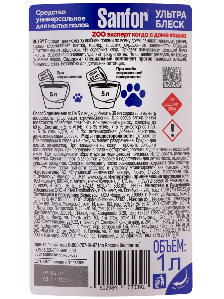 SANFOR Средство для мытья полов УЛЬТРА БЛЕСК "ZOO эксперт Когда в доме кошка", 1 л