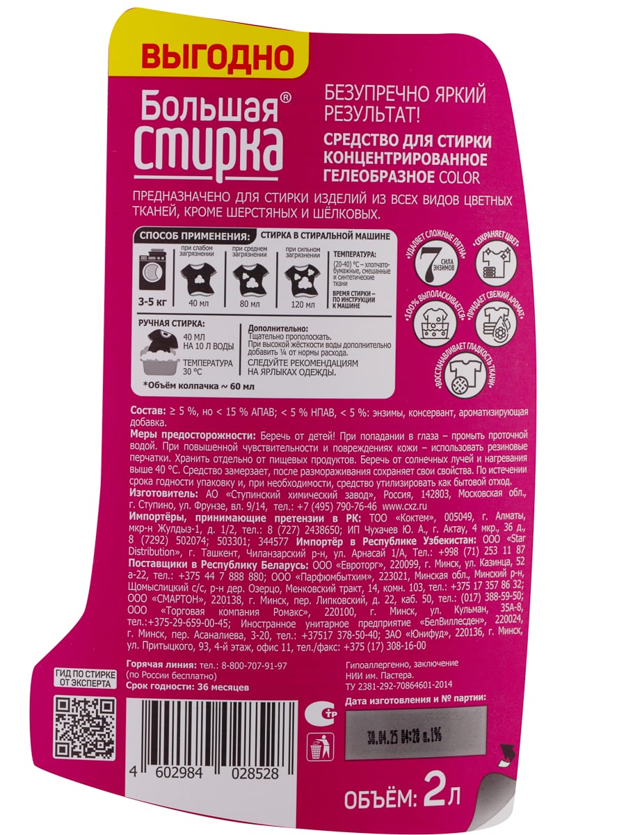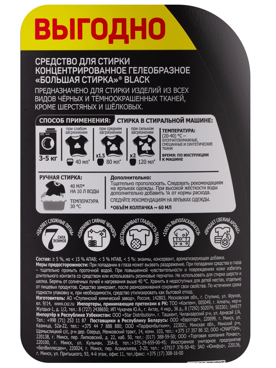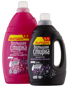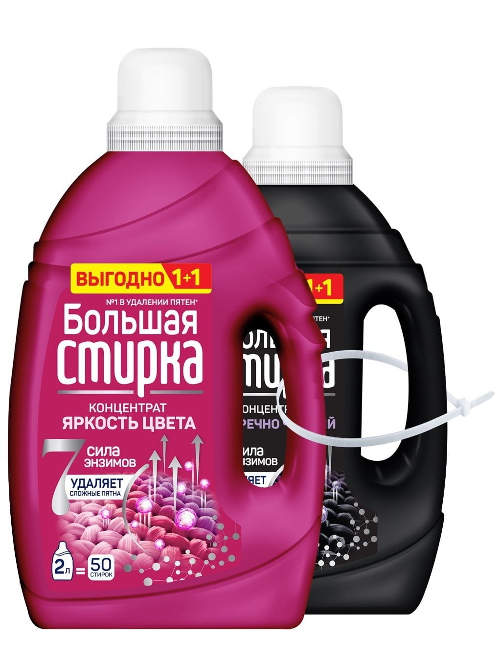 Большая стирка, набор гелей для стирки 1+1 Яркость цвета, 2л + Безупречно черный, 1,2л. Набор универсальных гелей-концентратов Большая стирка Яркость цвета 2000 мл и Гель-концентрат Безупречно черный 1200 мл - средства, которые идеально подходят для эффективной и бережной стирки черных, темно- окрашенных и цветных тканей. Благодаря инновационной формуле и жидкой текстуре, средства обладают не только очищающими свойствами, но и выполняют функцию смягчения, ароматизации и защиты тканей, обеспечивают полностью безупречный результат, не оставляя следов или разводов на вашей одежде. Гель-концентрат является универсальным решением, как для ручной стирки, так и для автоматических стиральных машин в воде любой жесткости.