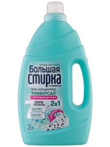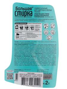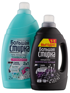 Большая стирка, набор гелей для стирки 1+1 Универсальный, 2 л + Безупречно черный, 1,2 л. Универсальный гель-концентрат для стирки «Большая стирка» - это уникальное средство, которое идеально подходит для эффективной и бережной стирки белых и цветных тканей. Благодаря инновационной формуле и жидкой текстуре, этот гель обладает не только очищающими свойствами, но и выполняет функцию смягчения, ароматизации и защиты тканей, обеспечивает полностью безупречный результат, не оставляя следов или разводов на вашей одежде. Гель является универсальным решением, как для ручной стирки, так и для автоматических стиральных машин (автомат) в воде любой жесткости. Этот уникальный продукт обладает высокой эффективностью и легко справляется с различными типами тканей (кроме шерсти и шелка). Средство гипоаллергенное, что подтверждено протоколом института им. Пастера. Формула геля разработана таким образом, чтобы сохранять яркость и насыщенность цвета вашей одежды, 100% выполаскивается из волокон ткани. Жидкий порошок содержит специальные компоненты, которые защищают ткани от загрязнений и сохраняют их красоту и свежесть. Благодаря своей гипоаллергенной и безопасной формуле, этот гель обеспечивает максимальную безопасность и комфорт. Концентрат обеспечивает мягкое и бережное отношение к волокнам тканей, сохраняя структуру и форму и предотвращая их износ и появления катышек, благодаря комплексу из 7 энзимов. Он эффективно удаляет пятна и загрязнения при любой температуре, обеспечивая безупречную чистоту и яркость вашей одежды. Благодаря своему концентрированному составу, всего один литр этого геля достаточно для множества стирок, что делает его экономичным и долговечным решением. Насладитесь приятным ароматом, который гель оставляет на вашей одежде. Средство подарит вещам изысканный легкий и расслабляющий аромат. Попробуйте бытовую химию «Большая стирка», и вы будете поражены его эффективностью, безупречными результатами и длительным сохранением свежести вашего белья. Средство для стирки концентрированное гелеобразное "БОЛЬШАЯ СТИРКА Безупречно черный" предназначено для стирки изделий из всех видов чёрных и темноокрашенных тканей, кроме шерстяных и шелковых. Формула включает специальный ополаскиватель, который делает вашу одежду мягкой на ощупь и устраняет статическое электричество. Состав средства свободен от токсичных веществ, поэтому оно полностью безопасно для человека. Запатентованный комплекс компонентов позволяет сохранить яркость темных оттенков без появления серых пятен и разводов даже после сотен циклов стирки. Гель с легкостью вымывается из структуры ткани.