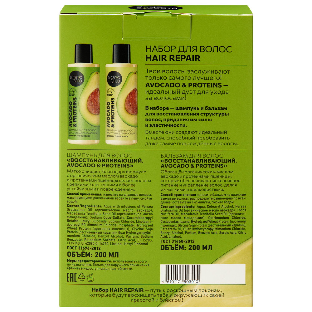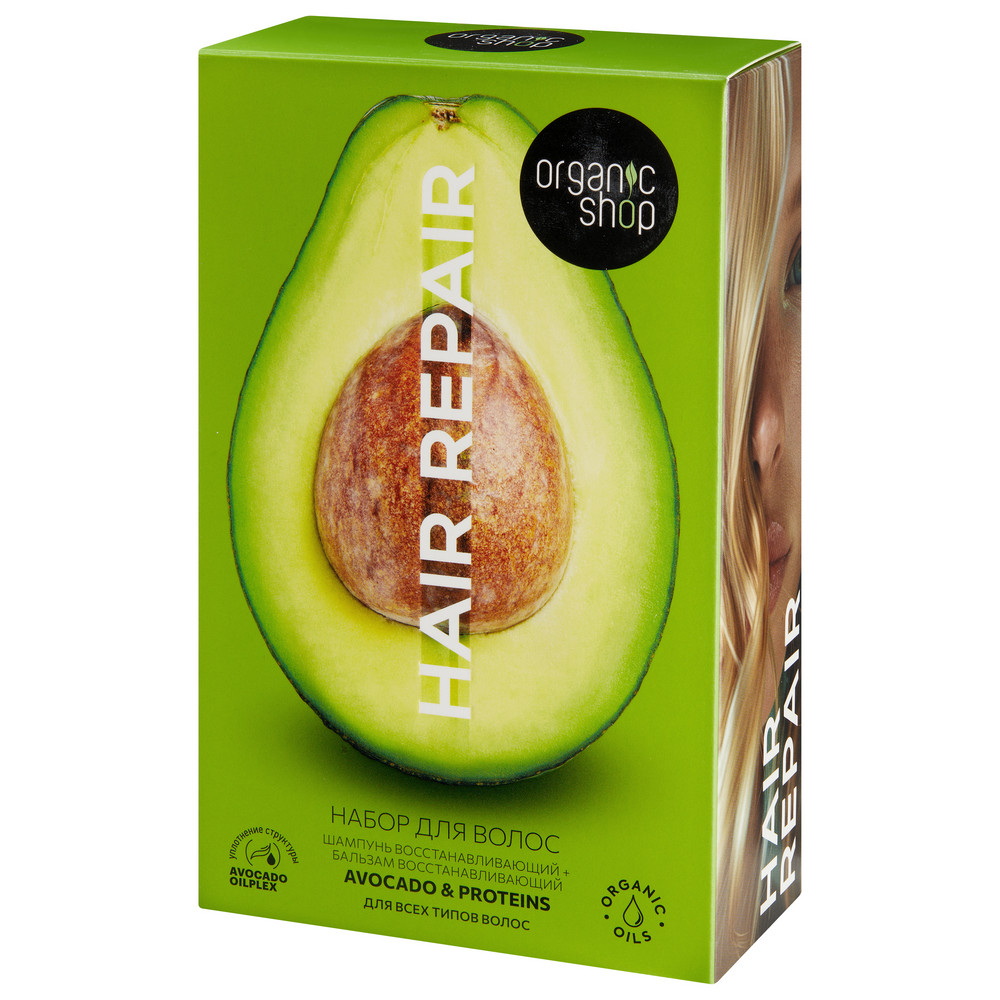 Подарочный набор ORGANIC SHOP для волос "HAIR REPAIR" Шампунь для волос "Восстанавливающий. Avocado & Proteins", Бальзам для волос "Восстанавливающий.