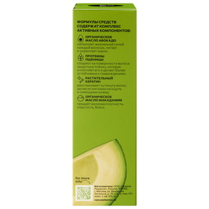 Обогащён органическим маслом авокадо и протеинами пшеницы, которые обеспечивают интенсивное питание и укрепление волос, делая их мягкими и шелковистыми.