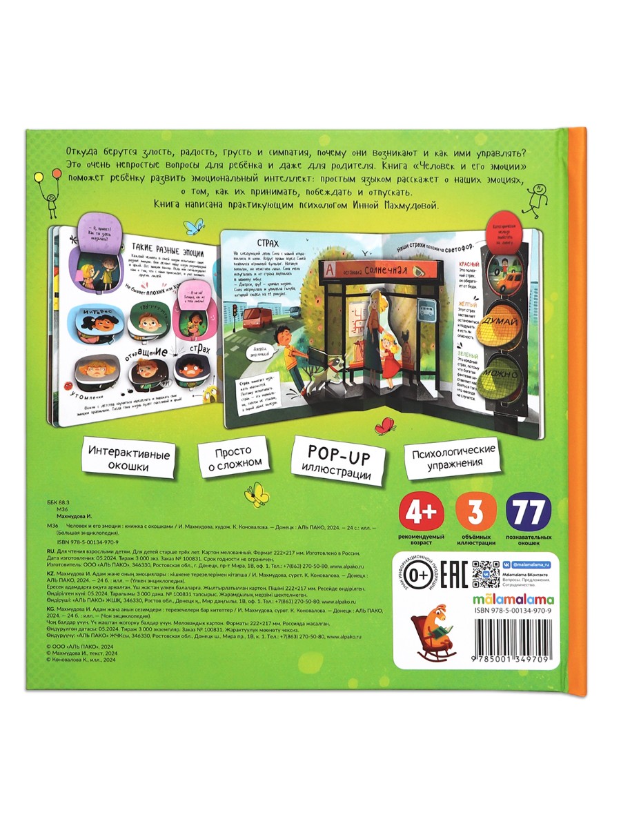 Энциклопедия «Человек и его эмоции» научит ребёнка с лёгкостью ориентироваться во внутреннем мире человека и глубже понимать себя и других. Малыш узнает, какие бывают чувства и эмоции, из-за чего они возникают и о чём сигнализируют, как с ними работать и как их выражать. Внутри книжки 24 страницы c красочными иллюстрациями, целых 77 окошек разной формы, объёмные POP-UP картинки и дорожки для пальчиков. Все интерактивные элементы дополняют процесс изучения и делают его весёлым и увлекательным. Читайте книжку вместе с вашим ребенком - проводите время интересно и с пользой! Книга сделана из плотного мелованного картона. Формат 222x217 мм. Количество страниц 24.