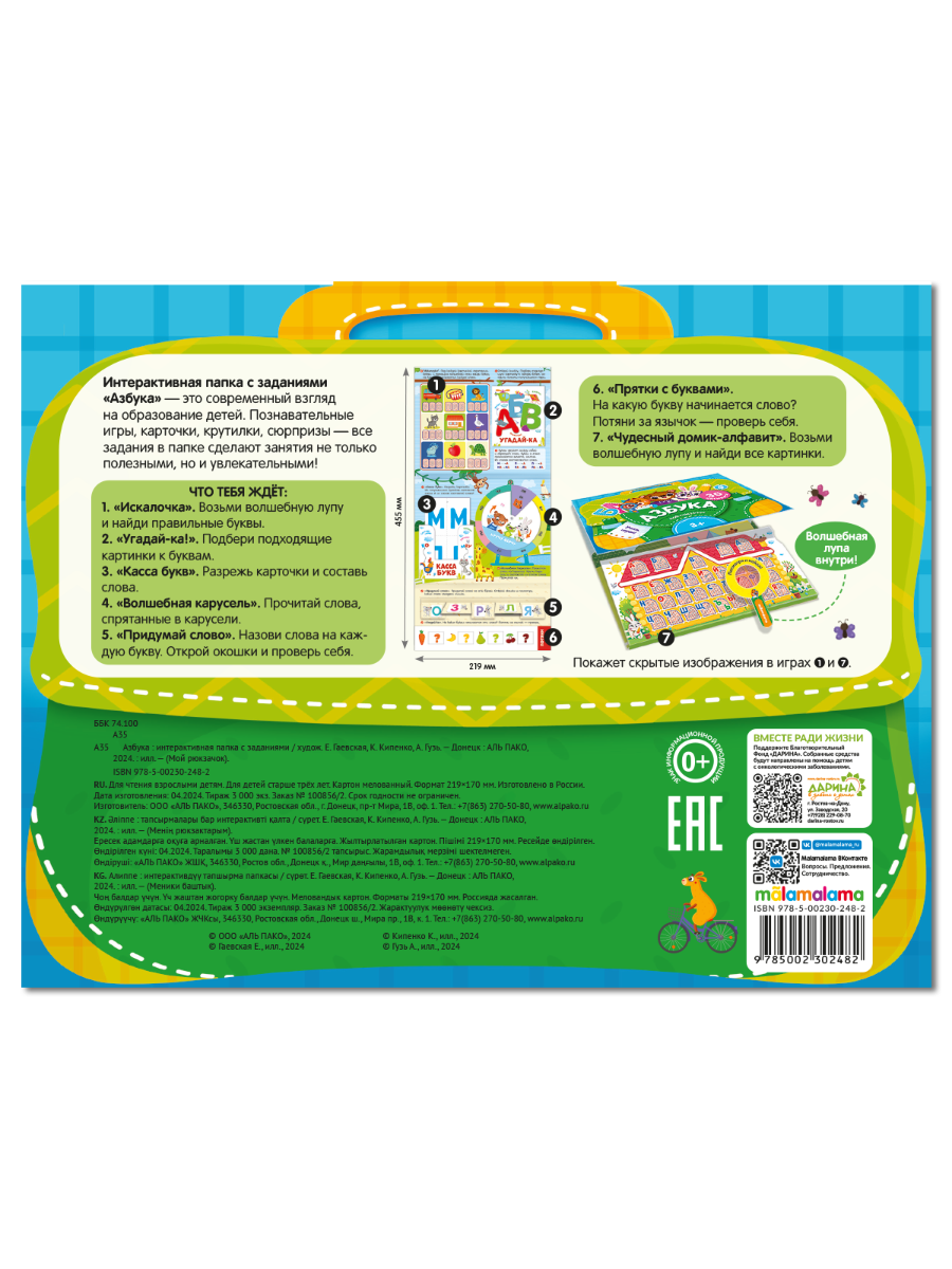 Лэпбук «Азбука» из серии «Мой рюкзачок» — это красочная папка с интересными развивающими заданиями. Карточки с буквами, крутящаяся карусель, волшебная лупа для поиска спрятанных картинок, окошки и другие интерактивные элементы сделают изучение алфавита и азов чтения нескучным и увлекательным занятием и подарят вашему малышу множество радостных моментов.Учиться легко и весело вместе с Malamalama! Количество страниц 3.