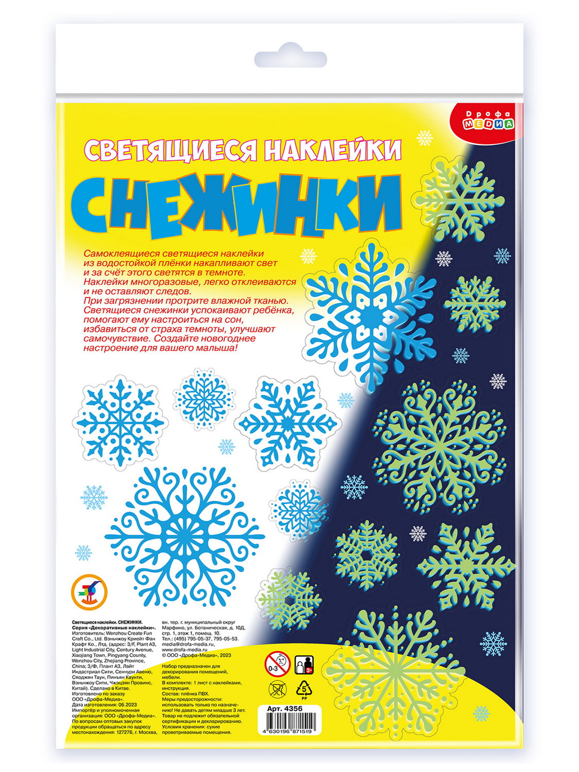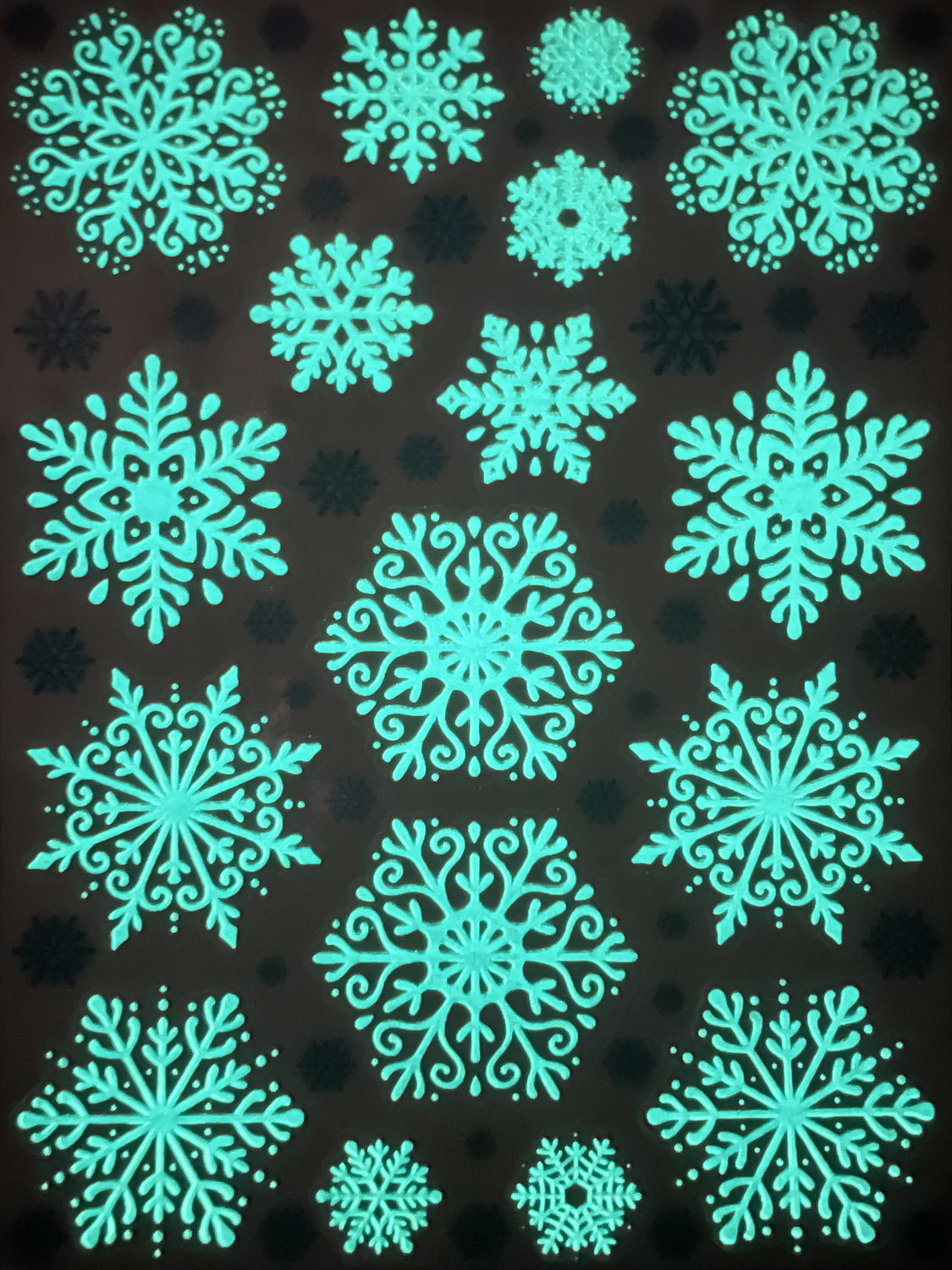 Самоклеящиеся новогодние наклейки из водостойкой плёнки накапливают тепло и за счёт этого светятся в темноте. Наклейки многоразовые, легко отклеиваются и не оставляют следов. Подходят для украшения детской комнаты, кухни, школьного класса или группы детского сада к Новому году.Светящиеся снежинки успокаивают ребёнка, помогают ему настроиться на сон, избавиться от страха темноты, улучшают настроение.