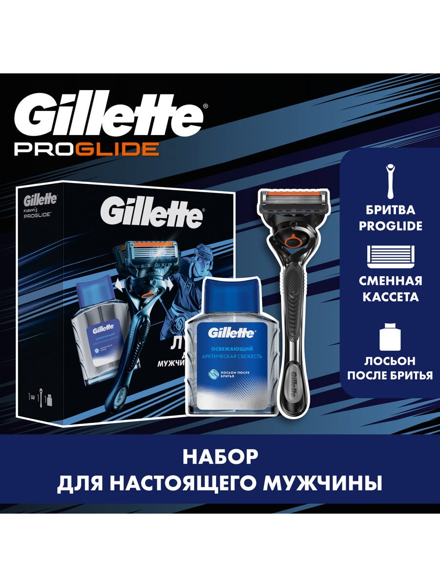 Подарочный набор для идеального бритья Gillette ProGlide. В набор входят бритва Gillette Fusion5 ProGlide и освежающий лосьон после бритья 50мл.ПРЕИМУЩЕСТВА