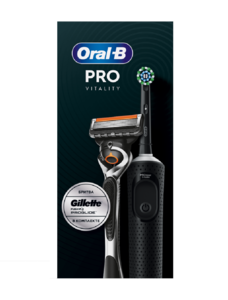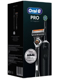 Электрическая зубная щетка нового поколения Oral-B Vitality PRO обеспечит ощущение профессиональной чистки каждый день и подойдет даже для любителей экстрабережного очищения благодаря уникальному режиму SENSITIVE PLUS. Oral-B Vitality PRO удаляет до 100% больше налета по сравнению с обычной зубной щеткой, а встроенный таймер оповестит вас о завершении 2-х минутной процедуры чистки.В наборе черная взрослая щетка Oral-B Vitality Pro и бритва для мужчин Gillette Fusion5 ProGlide.