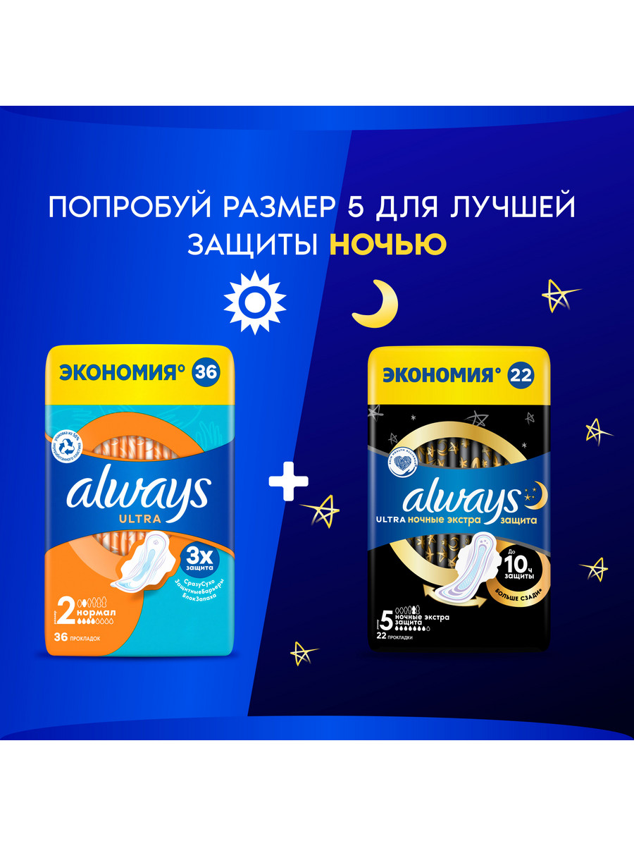 Попробуйте Always Ultra Secure Night Extra с крылышками — лучшие гигиенические прокладки Always для защиты в ночное время.