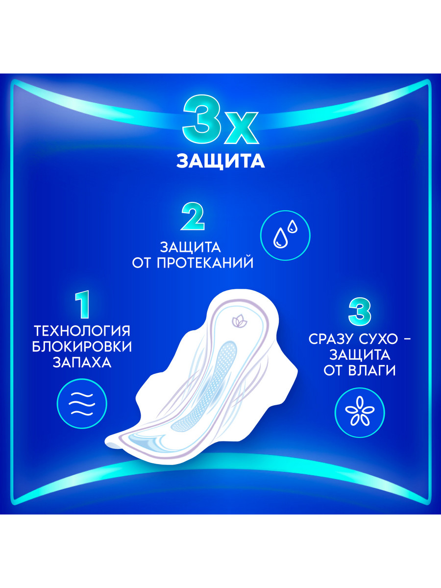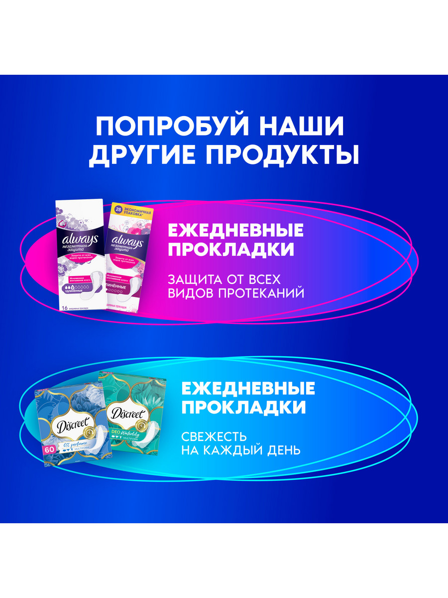 Обеспечьте себе наилучшую защиту с помощью Always My Fit — специальной системы определения размера, которая помогает правильно подобрать прокладку ALWAYS на основании количества выделений и размера трусиков. Супервпитывающий внутренний слой с системой «Сразу сухо», которая впитывает жидкость за считаные секунды. Технология «Защитные барьеры» удерживает жидкость, предотвращая протекания. Технология «Блок запаха» нейтрализует неприятные запахи. Гигиенические прокладки не раздражают кожу (доказано дерматологами). Крылышки помогают удерживать прокладку на месте для надежной защиты и ощущения комфорта.