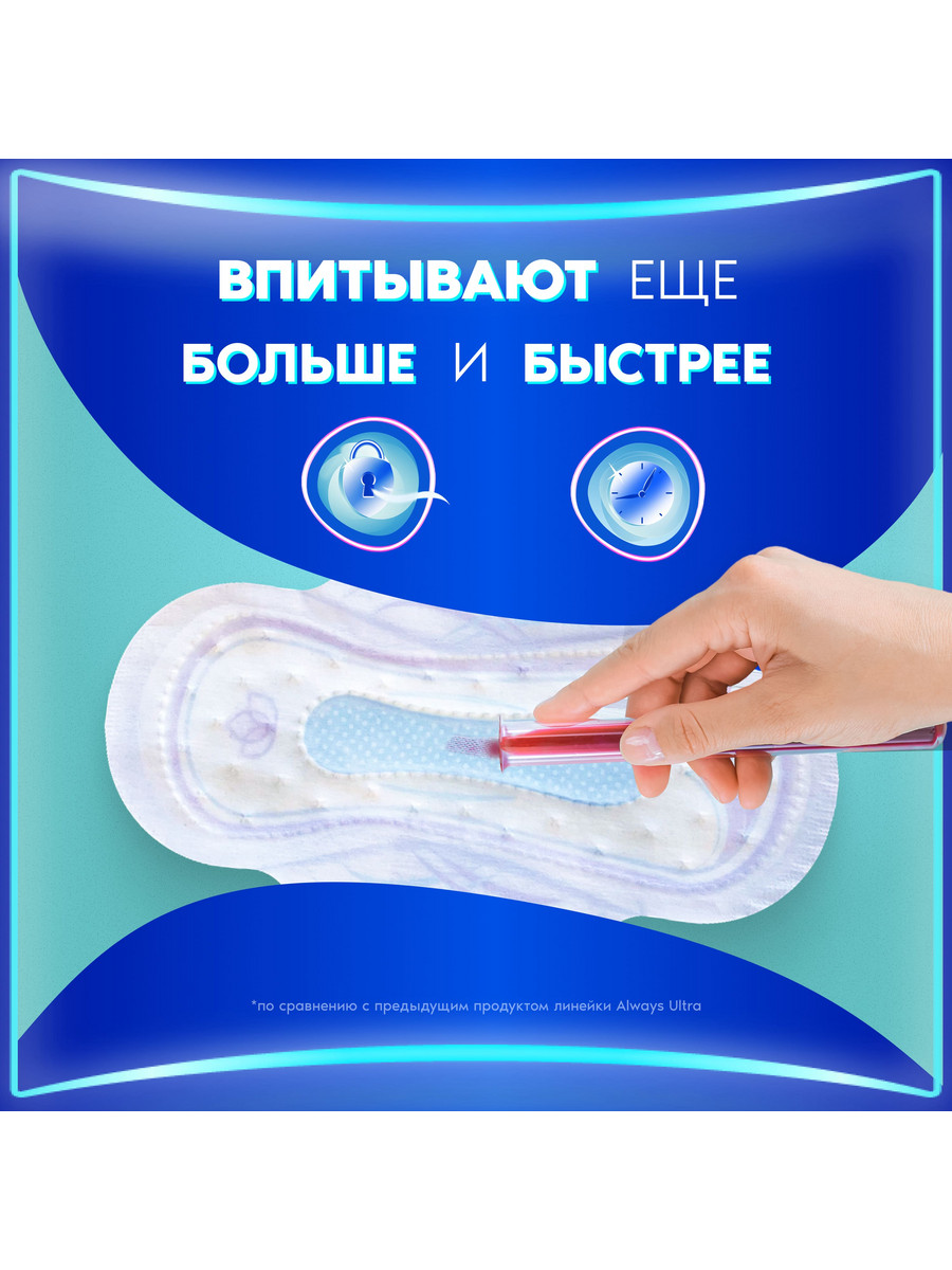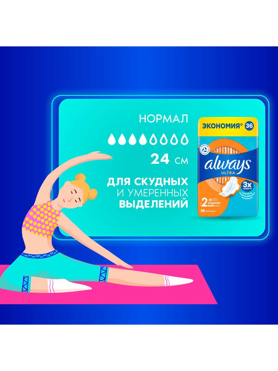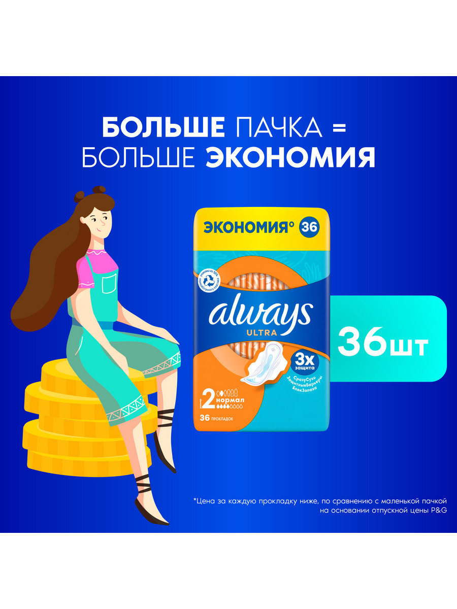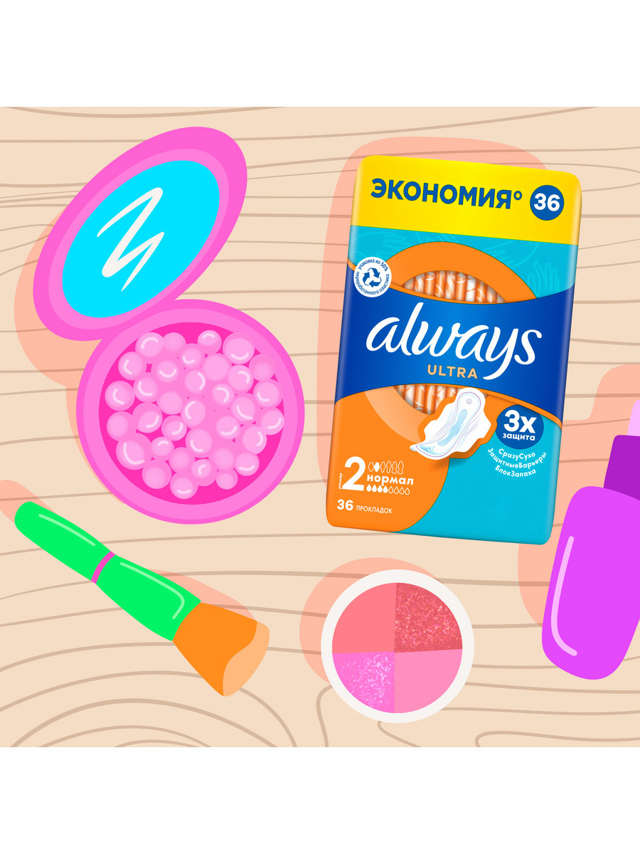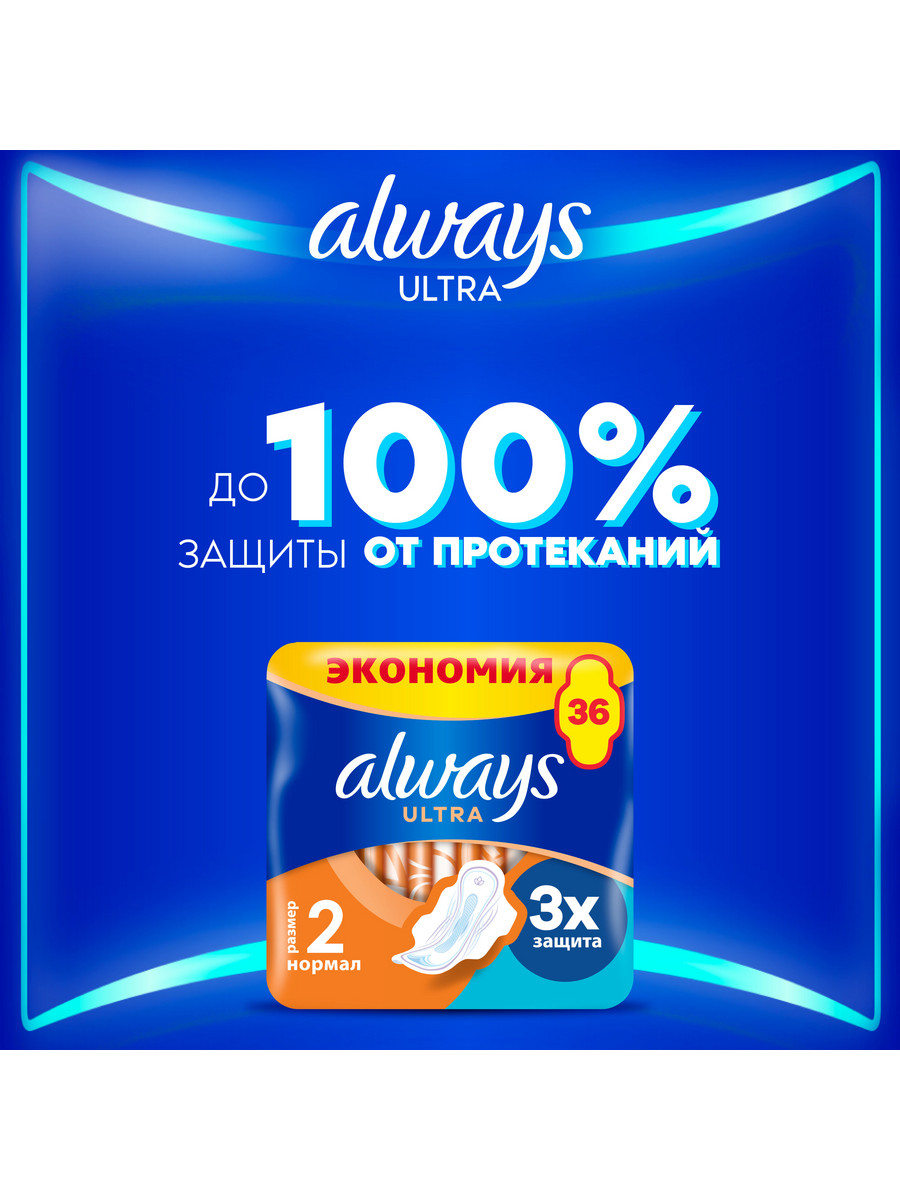 Тройная защита от Always — не соглашайтесь на меньшее: в Always Ultra Normal (Размер 2) с крылышками используется новейшая технология для создания многофункциональной гигиенической прокладки с 3 элементами защиты. Система «Сразу сухо» впитывает влагу за считаные секунды и не дает ей соприкасаться с кожей. Технология «Защитные барьеры» удерживает жидкость, предотвращая протекания. Технология «Блок запаха» нейтрализует неприятные запахи, придавая ощущение свежести и чистоты во время менструации. С Always Ultra вы можете чувствовать себя уверенно весь день. Тройная защита от Always — не соглашайтесь на меньшее.Формула дерматологически одобрена Ассоциацией здоровья кожи (Skin Health Alliance).