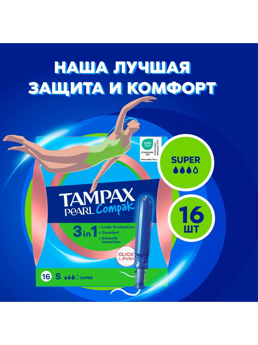Tampax Pearl Compak — наши лучшие тампоны, сочетающие комфорт, защиту и незаметность. Они не содержат ароматизаторов. Тампоны Tampax Pearl Compak имеют компактный гладкий пластмассовый аппликатор и закругленный кончик для комфортного введения. Благодаря нескользящему рельефу аппликатор удобно держать и вводить. Тампоны Tampax Pearl Compak оснащены технологией MotionFit, поэтому они мягко расширяются, принимая уникальную форму вашего тела. А особое плетение LeakGuard помогает предотвратить протекания. Tampax Pearl Compak имеют яркую индивидуальную упаковку с технологией легкого и бесшумного открывания, поэтому их можно носить в сумочке и использовать в любой ситуации. Tampax Pearl Compak Super — наши лучшие тампоны для умеренных выделений. Тампоны Tampax Pearl Compak прошли гинекологические испытания. Они также прошли независимую проверку на содержание вредных веществ по стандарту Oeko-Tex.