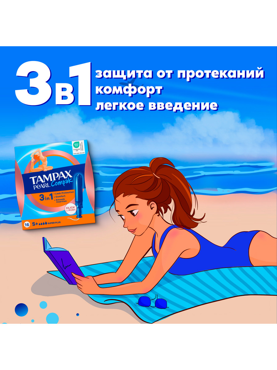 Tampax Pearl Compak — наши лучшие тампоны, сочетающие комфорт, защиту и незаметность. Они не содержат ароматизаторов. Тампоны Tampax Pearl Compak имеют компактный гладкий пластмассовый аппликатор и закругленный кончик для комфортного введения. Благодаря нескользящему рельефу аппликатор удобно держать и вводить. Тампоны Tampax Pearl Compak оснащены технологией MotionFit, поэтому они мягко расширяются, принимая уникальную форму вашего тела. А особое плетение LeakGuard помогает предотвратить протекания. Tampax Pearl Compak имеют яркую индивидуальную упаковку с технологией легкого и бесшумного открывания, поэтому их можно носить в сумочке и использовать в любой ситуации. Tampax Pearl Compak Super Plus — наши лучшие тампоны для умеренных выделений. Тампоны Tampax Pearl Compak прошли гинекологические испытания. Они также прошли независимую проверку на содержание вредных веществ по стандарту Oeko-Tex.