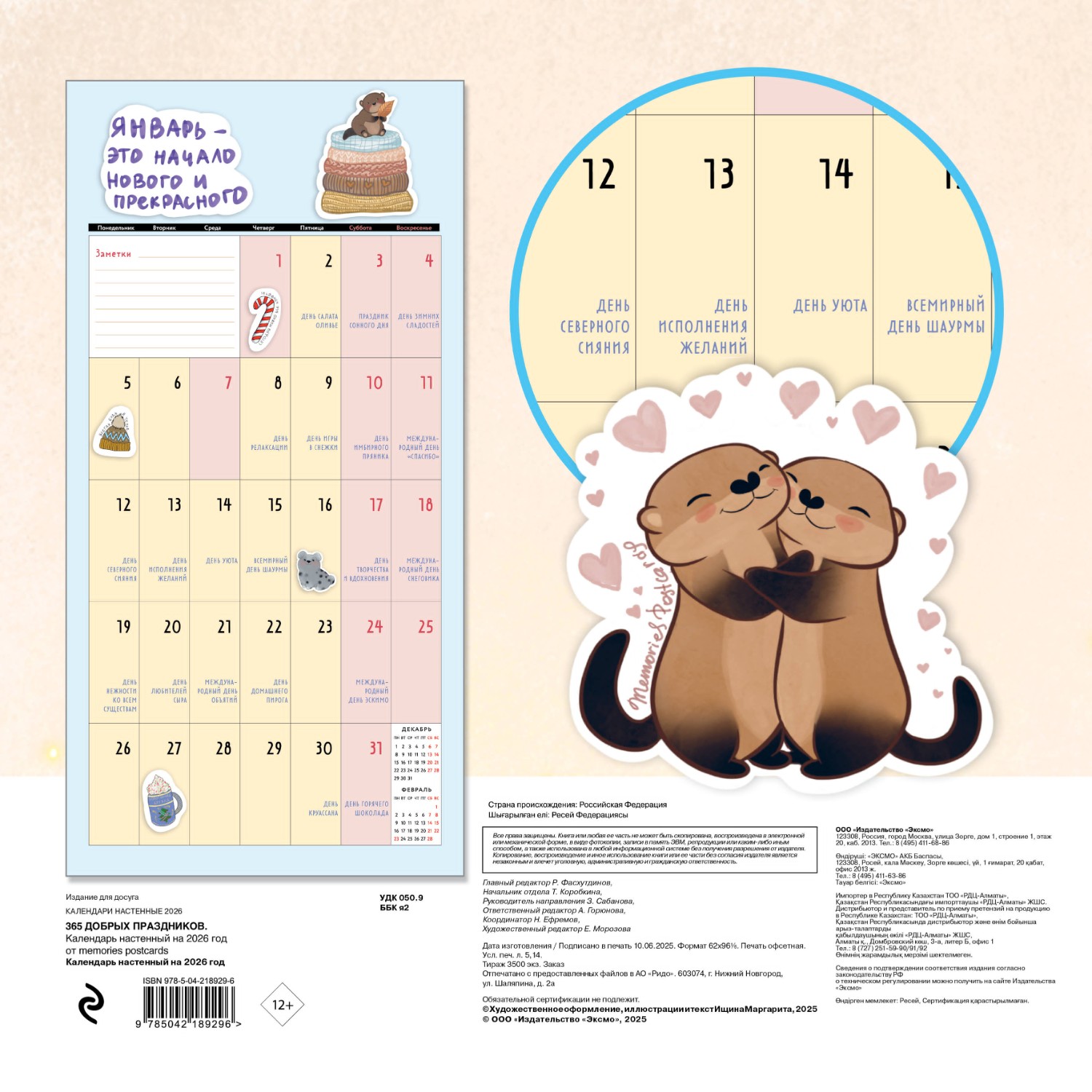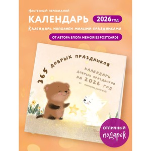 365 добрых праздников – яркий настенный календарь на 2026 год, который каждый день дарит повод для радости! В нем вы найдете необычные праздники, вдохновляющие цитаты и добрые пожелания. Удобный формат, красочный дизайн и позитивный настрой сделают его отличным украшением дома и оригинальным подарком для близких. Автор календаря - Маргарита Ищина, художница-мультипликатор, автор страницы @memories postcard и канала "Добрые рисульки"