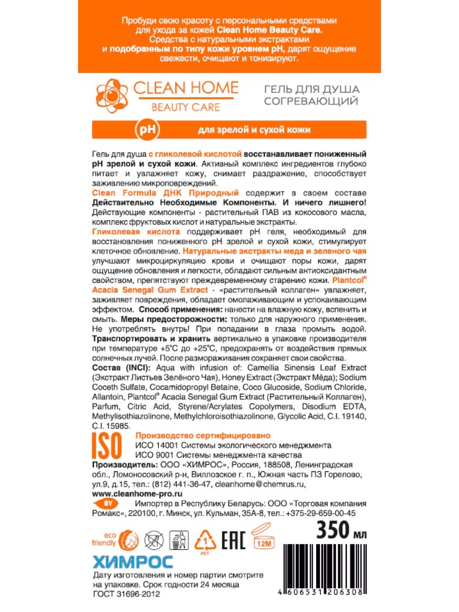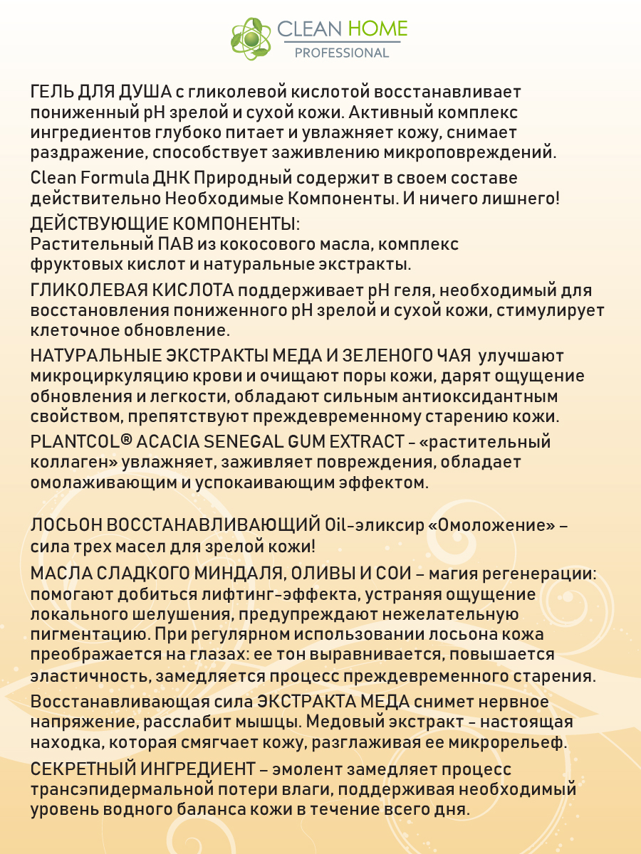 Гель для душа согревающий: Гель для душа с гликолевой кислотой восстанавливает пониженный pH зрелой и сухой кожи. Активный комплекс ингредиентов глубоко питает и увлажняет кожу, снимает раздражение, способствует заживлению микроповреждений.Clean Formula ДНК Природный содержит в своем составе Действительно Необходимые Компоненты. И ничего лишнего! Действующие компоненты - растительный ПАВ из кокосового масла, комплекс фруктовых кислот и натуральные экстракты.