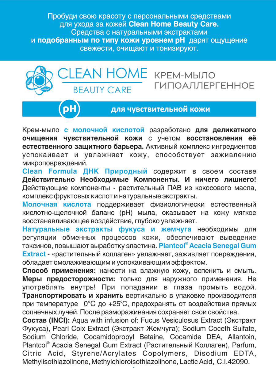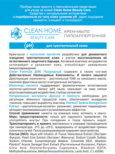 Крем-мыло гипоаллергенное: Состав (INCI): Aqua with infusion of: Fucus Vesiculosus Extract (Экстракт Фукуса), Pearl Coix Extract (Экстракт Жемчуга); Sodium Coceth Sulfate, Sodium Chloride, Cocamidopropyl Betaine, Cocamide DEA, Allantoin, Plantcol® Acacia Senegal Gum Extract (Растительный Коллаген), Parfum, Citric Acid, Styrene/Acrylates Copolymers, Disodium EDTA, Methylisothiazolinone, Methylchloroisothiazolinone, Lactic Acid