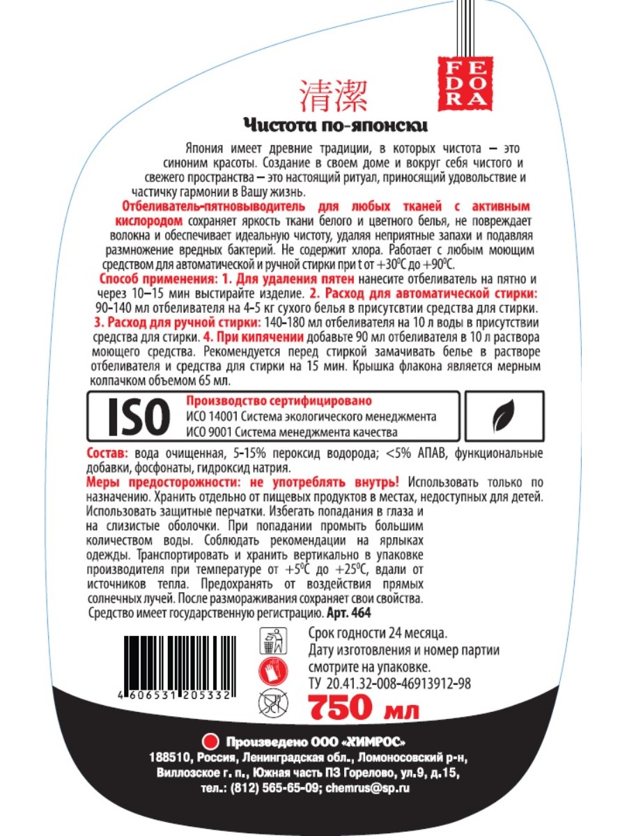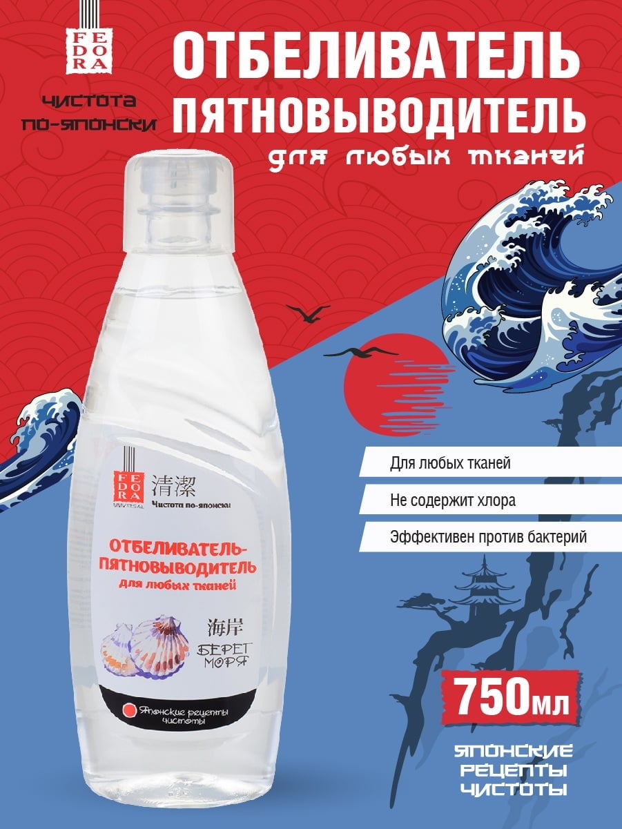 FEDORA "Чистота по-японски" Отбеливатель-пятновыводитель для любых тканей "Берег моря" 750мл