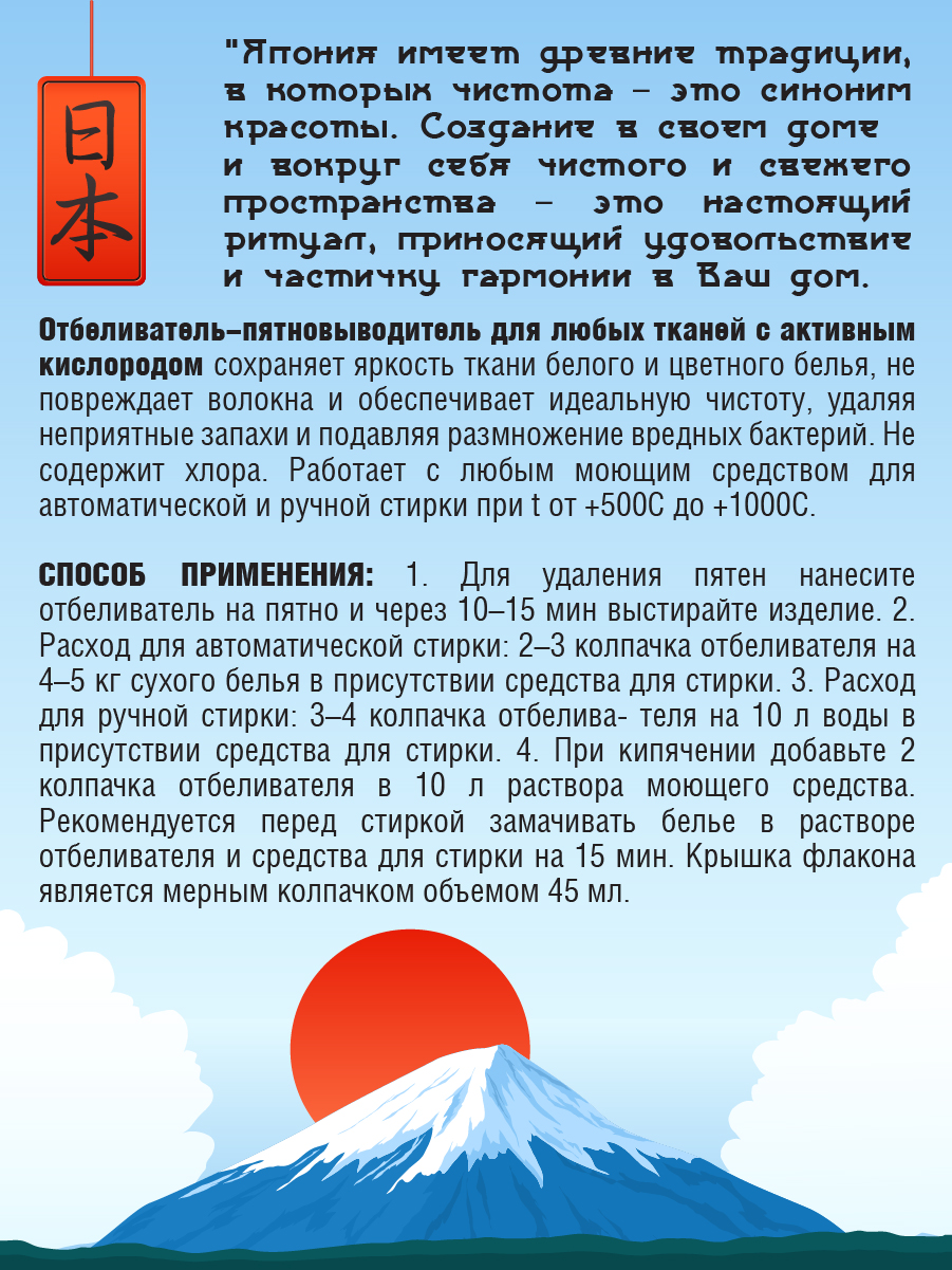 Отбеливатель-пятновыводитель для любых тканей с активным кислородом сохраняет яркость ткани белого и цветного белья, не повреждает волокна и обеспечивает идеальную чистоту, удаляя неприятные запахи и подавляя размножение вредных бактерий. Не содержит хлора. Работает с любым моющим средством для автоматической и ручной стирки при t от +50°С до +100°С.