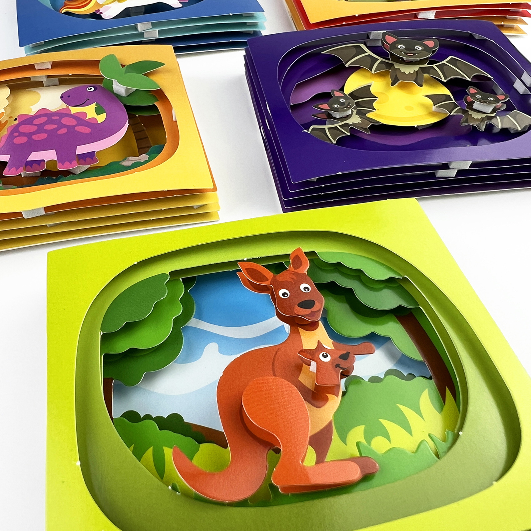 Ребёнок самостоятельно сможет создать красочную 3D-аппликацию, последовательно наклеив детали в несколько слоёв. Каждая аппликация уникальна. И каждая состоит из плоских картинок, которые чудесным образом собираются в глубокое, объёмное изображение.
