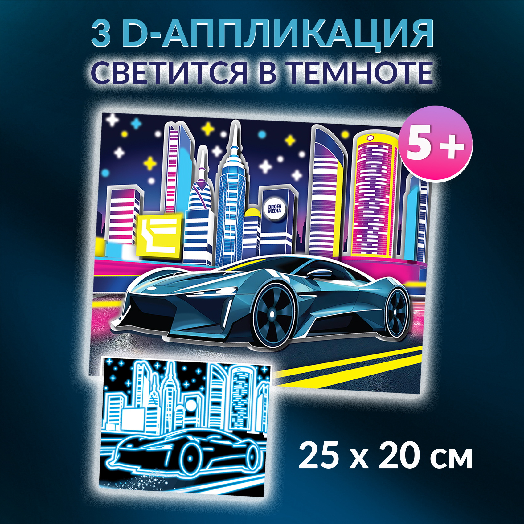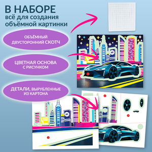 3D-аппликация – современный и очень увлекательный вид творчества. Уникальность нашей аппликации в том, что она не только создает эффект 3D-картины, но и светится в темноте. В творческом наборе вы найдёте готовые детали для аппликации из плотного картона, которые нужно приклеить на картинку с помощью двустороннего скотча.Яркие и красочные детали, наклеенные в несколько слоёв, придадут плоскому изображению удивительный 3D-эффект, создавая необычную 3D-картину. Особой выразительности картине придаст светящийся эффект, будто гоночная машина едет по ночному городу.