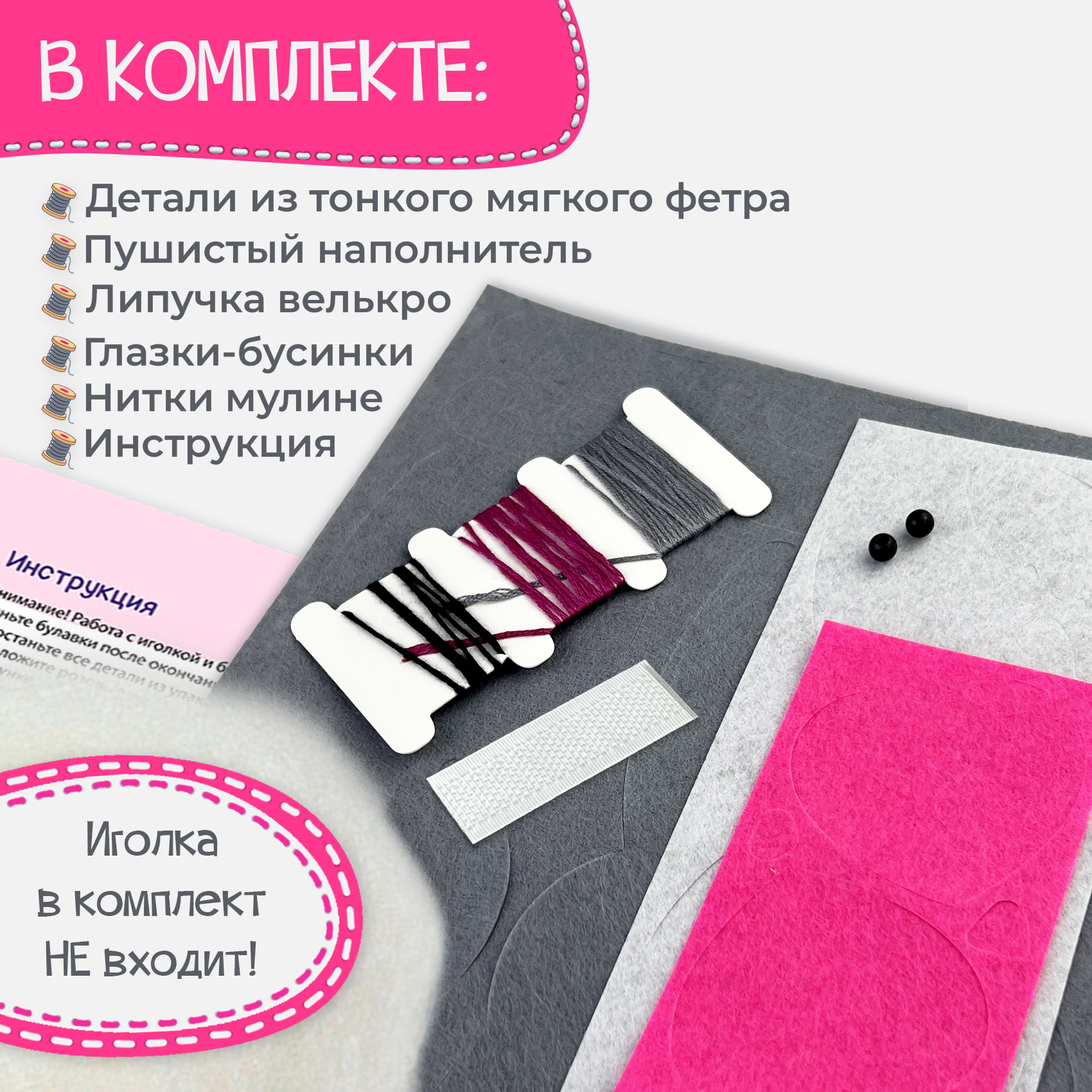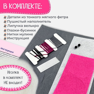 В комплекте: фетр, нитки, бусинки, липучка, наполнитель. Иголки и булавки в комплект не входят!