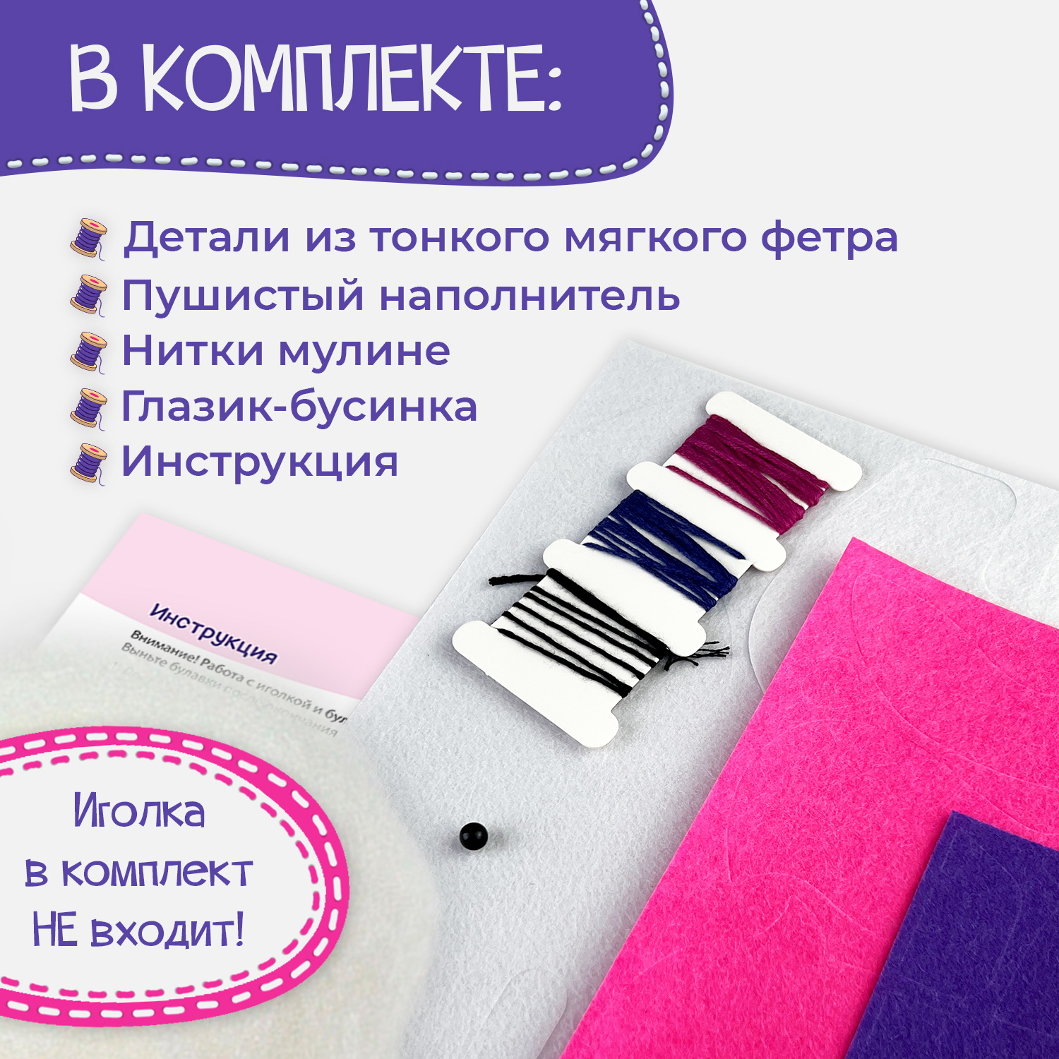 В комплекте: фетр, нитки, бусинка, наполнитель. Иголки и булавки в комплект не входят!