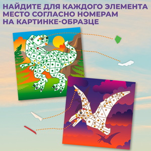Найдите для каждого из разноцветных элементов место согласно номерам на картинке-образце на обратной стороне листовки. Сняв деталь с защитного слоя, нужно просто наклеить её на нужное место. Вуаля! Динозавр прямо перед вами. И для этого вам не понадобятся ни ножницы, ни клей! Все, что вам нужно, уже входит в набор!