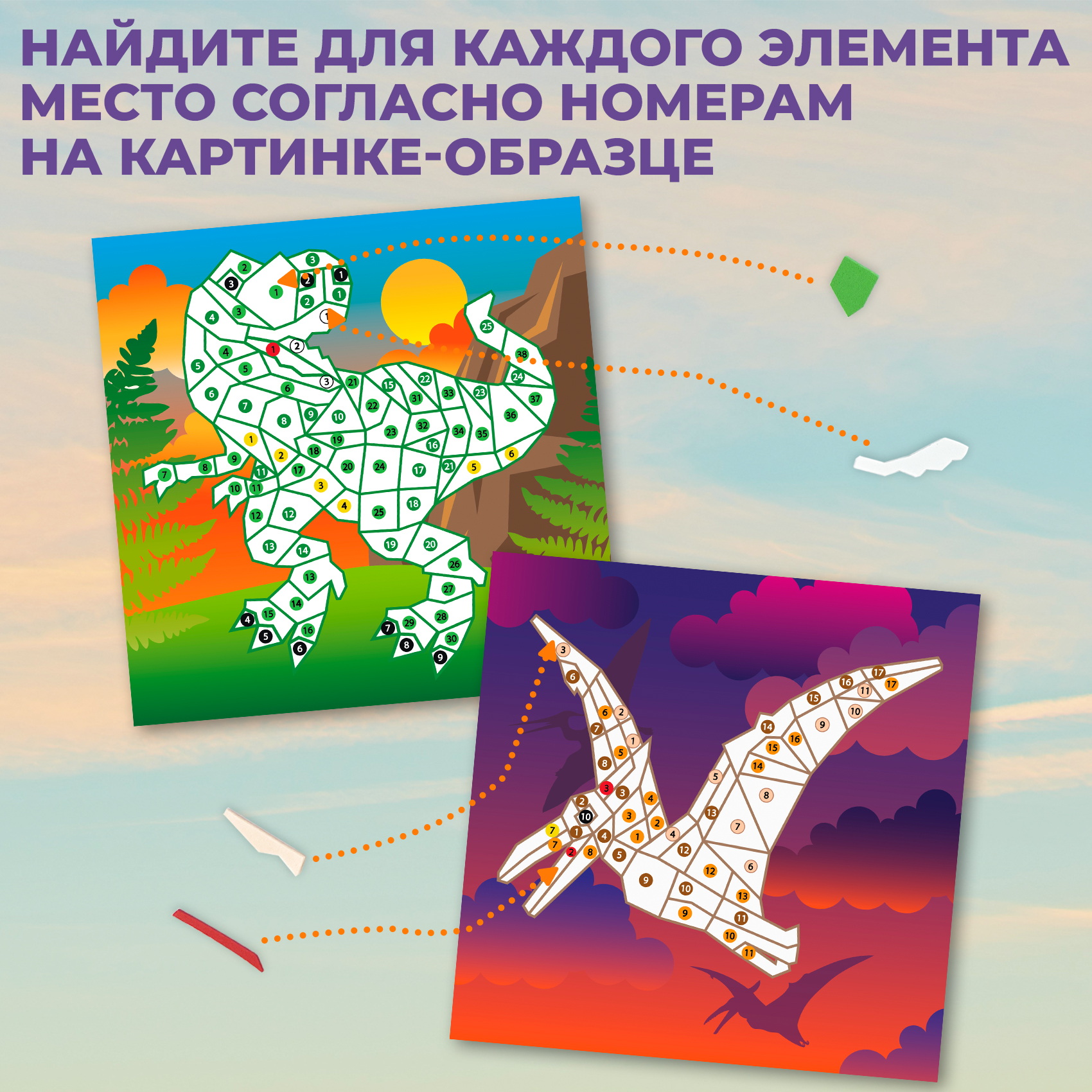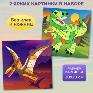 2 стильные объёмные аппликации в 1 наборе!Прояви смелость и рискни вдохнуть жизнь в древних ящеров с помощью геометрических фигур. Собери тираннозавра, устрашающего каждого мимо пробегающего динозавра, и птеродактиля, парящего под древним солнцем.