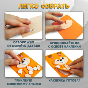 Аппликация – это интересное и полезное занятие для детей разного возраста. В нашем наборе вы найдёте всё для создания замечательных наклеек-аппликаций.Элементы аппликации выполнены из приятного на ощупь безопасного материала ЭВА. Сделать объёмные наклейки очень просто: снимайте с деталей защитную плёнку и приклеивайте на фигурку в соответствии с картинкой-образцом. Обратите внимание ребёнка на последовательность наклеивания деталей – что должно оказаться снизу, а что сверху.