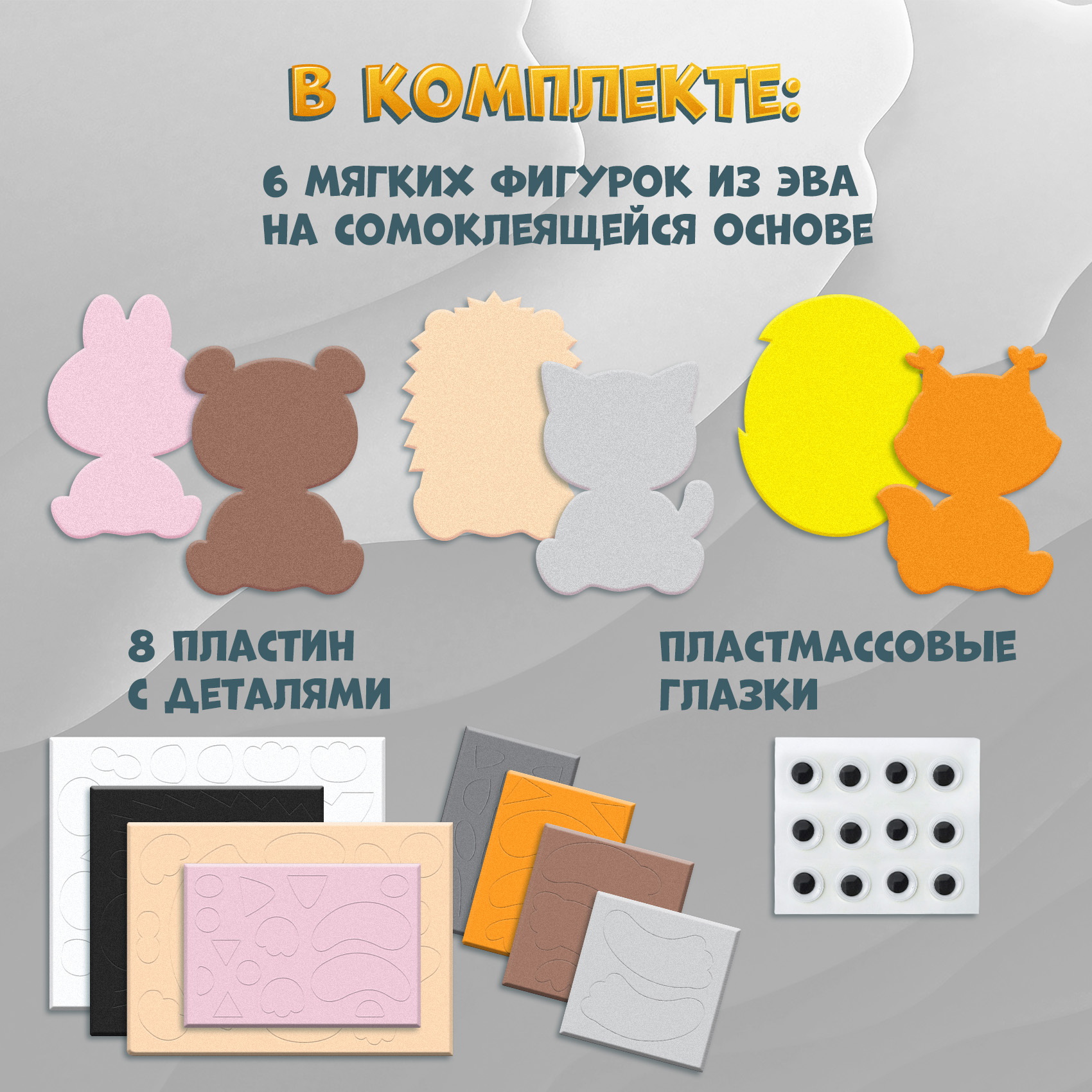 В комплекте: 6 фигурок из мягкого пластика ЭВА на самоклеящейся основе, 8 пластин с деталями, пластмассовые глазки.