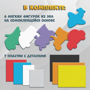 В комплекте: 6 фигурок из мягкого пластика ЭВА на самоклеящейся основе, 7 пластин с деталями.