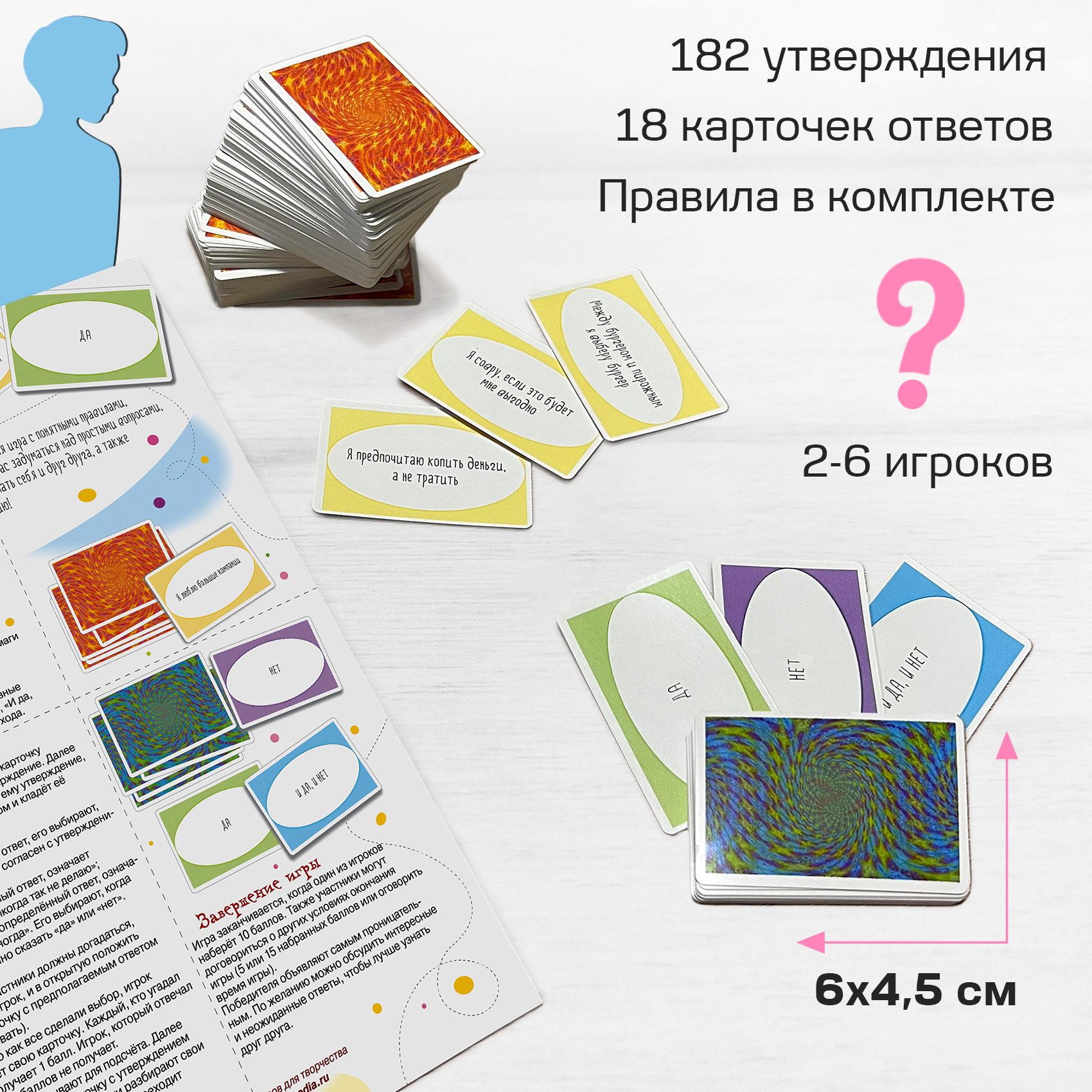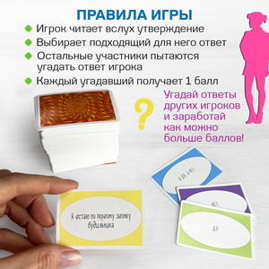 Вы хорошо знаете своих друзей и членов семьи? А может быть вообще, чувствуете людей и умеете читать мысли? Приготовьтесь удивиться и узнать друг друга и самих себя с новой стороны. Эта игра проверит наличие у вас шестого чувства и покажет, кто из компании самый проницательный. Отвечайте на вопросы, угадывайте ответы других игроков, получайте баллы и выигрывайте с помощью интуиции!В комплекте: 200 карточек из картона, правила.