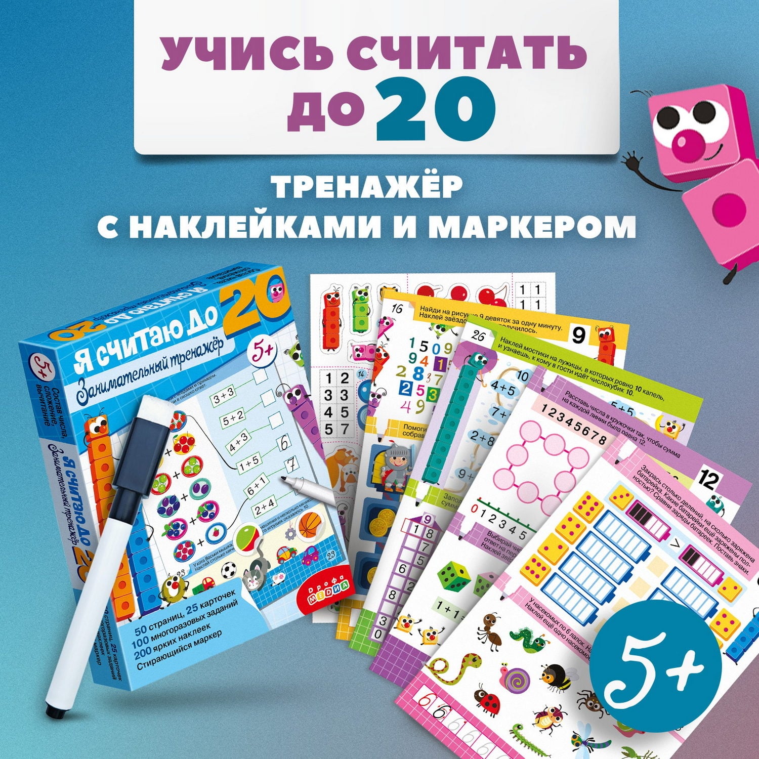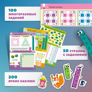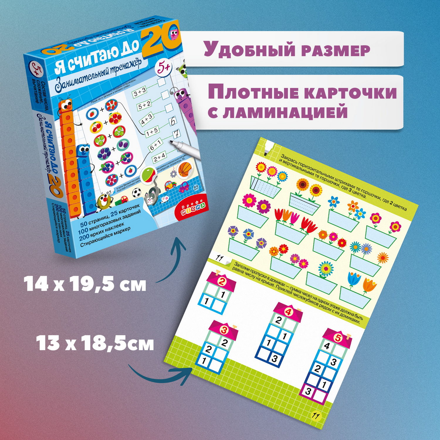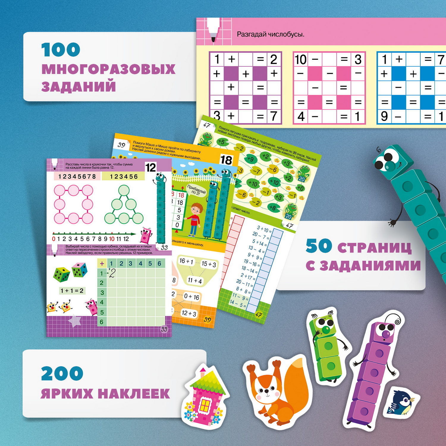 Занимательные карточки-тренажеры заинтересуют ребенка математикой и научат получать удовольствие от решения примеров. Задания выстроены от простого к сложному и подходят как дошкольникам, не знакомым с цифрами, так и школьникам 1-2 классов для отработки навыков счета.Для записей используется стирающийся маркер. На каждой странице есть задание с наклейками, которые так нравятся детям.
