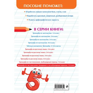 Тренажёр по чистописанию, соответствующий ФГОС (букварный и послебукварный периоды), - отличный помощник первоклассника по формированию красивого, разборчивого, аккуратного почерка, усвоению приёмов правильного письма, укреплению мелких мышц руки, развитию внимания, памяти, глазомера. Работая в книге, школьники будут выполнять задания на отработку навыков написания букв и их элементов, слогов, слов и простых предложений, повторят алфавит, правописание безударной гласной в корне, глухих и звонких согласных, заглавной буквы, словарных слов, сочетаний ЖИ-ШИ, ЧА-ЩА, ЧУ-ЩУ, ЧК, ЧН, ЧТ. Пособие поможет ученикам дополнительно позаниматься и закрепить полученные в школе умения.Первокласснику тяжело долго заниматься непрерывным письмом. Переключить внимание ребёнка помогут игровые задания. Упражнения на обводку предметов по пунктиру, штриховку в разных направлениях, копирование и дорисовывание узоров послужат дополнительной тренировкой для укрепления мелких мышц руки.