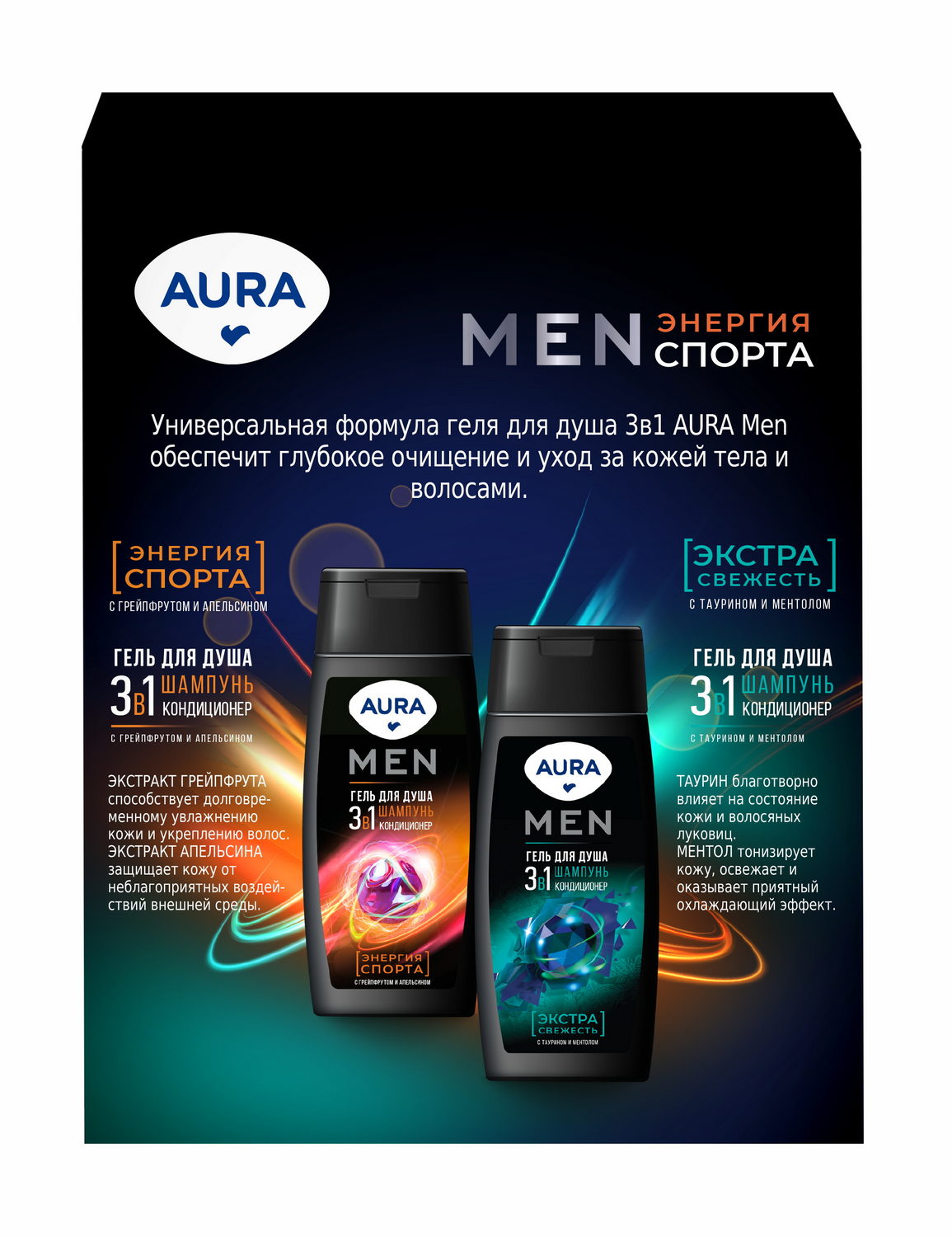 AURA MEN Подарочный набор Энергия спорта: Гель для душа 3в1 Энергия Спорта 250 мл + Гель для душа 3в1 Экстра Свежесть 250 мл