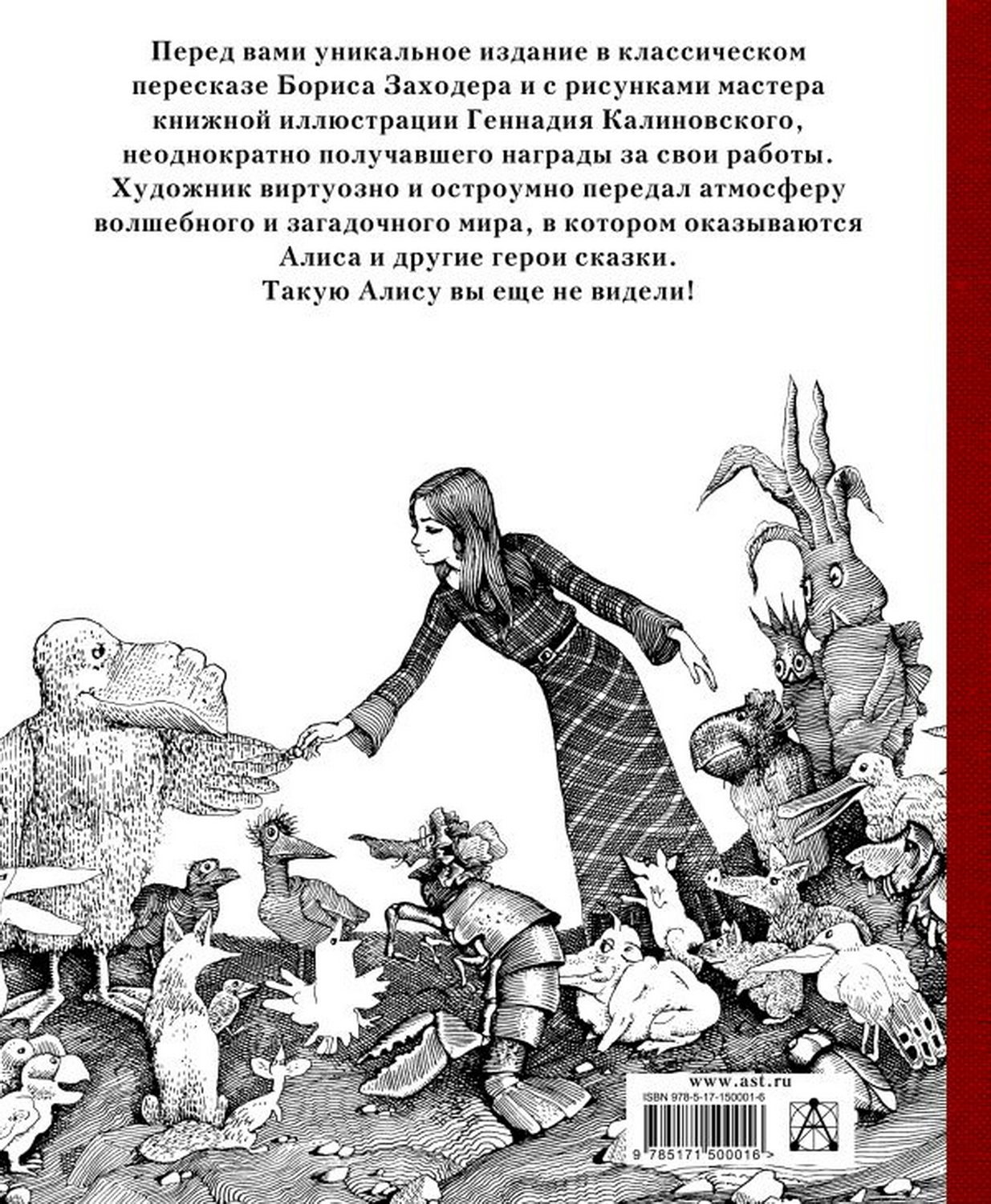 Перед вами уникальное издание в классическом пересказе Бориса Заходера и с рисунками мастера книжной иллюстрации Геннадия Калиновского, неоднократно получавшего награды за свои работы. Художник виртуозно и остроумно передал атмосферу волшебного и загадочного мира, в котором оказываются Алиса и другие герои сказки.Такую Алису вы еще не видели!