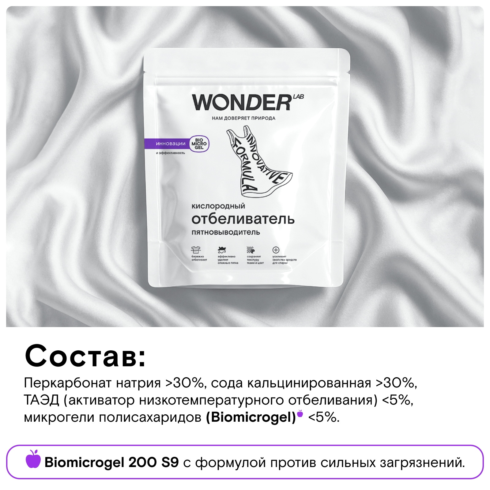 У кислородного отбеливателя безопасный состав на основе Biomicrogel из овощей и фруктов. Продукт не содержит хлора, фосфатов и фосфонатов.