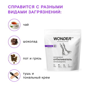 Универсальный кислородный отбеливатель-пятновыводитель WONDER LAB подходит для белого и цветного белья, для детской одежды, его можно применять для машинной и ручной стирки, для замачивания и предварительной обработки. Кислородный пятновыводитель эффективно удаляет сложные пятна от чая, шоколада, пота, пыли и грязи. Подходит для выведения следов от косметики: тонального крема и туши для ресниц, помады.Экологичный пятновыводитель мягко устраняет желтизну с белого белья, бережно отбеливает, усиливает свойства средств для стирки. Отбеливатель-пятновыводитель полностью выполаскивается из ткани, сохраняя её структуру и цвет.