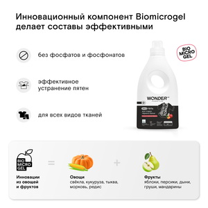 Гели для стирки и другие экосредства WONDER LAB не содержат токсичных компонентов, фосфаты, фосфонаты и других опасных для природы или человека. И всё это благодаря инновационному компоненту Biomicrogel, который сделан из овощей и фруктов. Средства WONDER LAB не вредят окружающей среде, не содержат токсичных компонентов и разлагаются на 98% за 1 день.