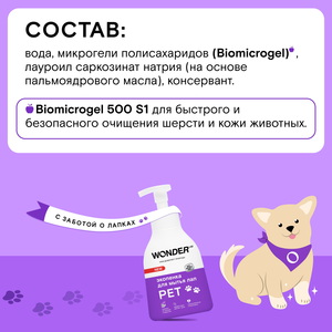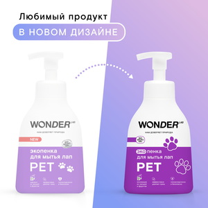Экопена для мытья лап питомцев после прогулки от WONDER LAB незаменима для кошек, собак и остальных выгуливаемых питомцев, живущих в квартирах и домах. Грязь, пыль, реагенты и другие следы веселых прогулок легко смоются экопенкой. Пена не пахнет и не остается на шерсти, поэтому средство для мытья лап безопасно для животного при вылизывании. Экологичная пенка для лап гипоаллергенна, не сушит и не раздражает кожу домашних любимцев.Экосредства WONDER LAB созданы на основе инновационного компонента Biomicrogel, который сделан из овощей и фруктов. Средства WONDER LAB не вредят окружающей среде, не содержат опасных компонентов и разлагаются на 98% за 1 день.