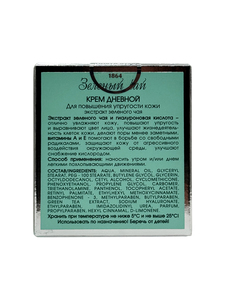 Основной компонент - экстракт зеленого чая. Он увлажняет, тонизирует и выравнивает цвет лица, оказывая антиоксидантное действие, способствующее регенерации кожи. Крем оказывает увлажняющий и восстанавливающий эффект: разглаживает морщины, повышает эластичность кожи, способствует сохранению овала лица.