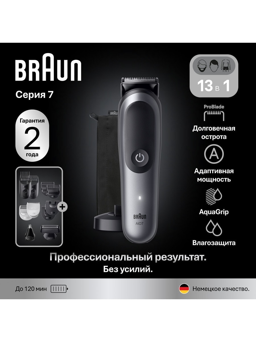 Профессиональный стайлинг без усилий 13 в 1 с триммером Braun 7 Серии. Премиальный эргономичный дизайн и немецкое качество обеспечивают максимальное удовольствие и удобство во время ежедневного использования, а технология AutoSense подстроит мощность под любую густоту щетины. Ультра-острые лезвия ProBlade из нержавеющей стали имеют долговечный срок службы, для качественного результата ежедневно, годами. Мужской триммер для всего тела Braun AIO7560 изготовлен из прочных материалов и, обладая 100% водонепроницаемостью, предназначен для сухого и влажного бритья, а прорезиненная ручка AquaGrip даёт непревзойденное чувство контроля в воде. Этот триммер работает как от сети, так и от аккумулятора. Мощный аккумулятор позволяет использовать устройство до 120 минут непрерывной работы. В комплекте идут 9 насадок (для коротких и длинных волос, для щетины, для точного подравнивания и детализации, сеточная бритва-насадка, SkinSensitive и SkinGuard для тела, для бровей, носа и ушей), зарядная станция, премиальный чехол для хранения и щёточка для чистки триммера.Особенности устройства: