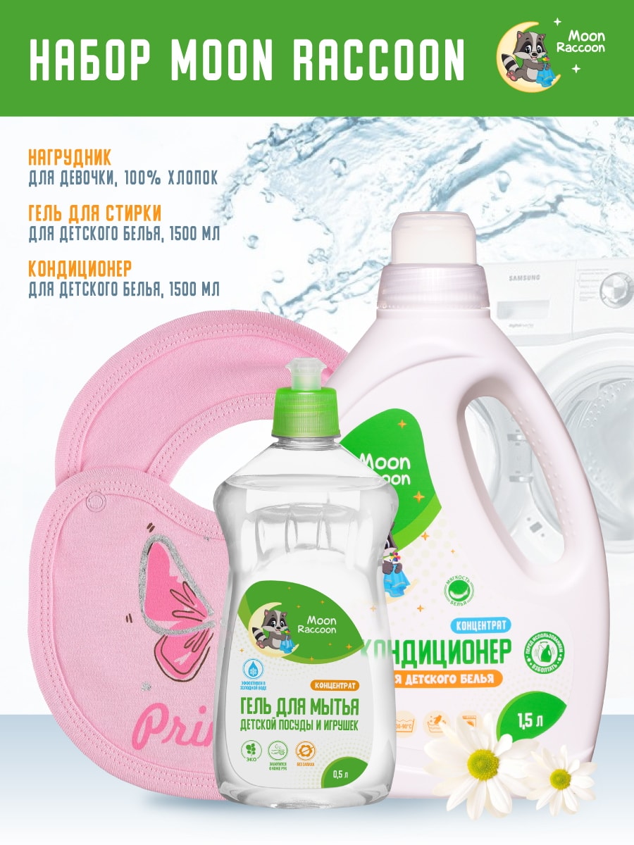 Moon Raccoon Premium Care Набор Кондиционер концентрат 1500мл + Гель для посуды 500мл + подарок Нагрудник розовый