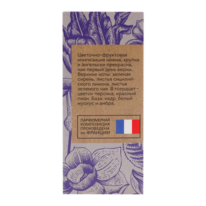 Легкий аромат сирени обладает сладкой и нежной нотой, который погрузит в атмосферу ностальгии и романтики.ВЕРХНИЕ НОТЫ: ЗЕЛЁНАЯ СИРЕНЬ, ПИОН, ПЕТИТГРЕЙН;НОТЫ СЕРДЦА: ПЕРСИКОВЫЙ ЦВЕТ, ЗЕЛЁНЫЙ ЧАЙ;НОТЫ БАЗЫ: АМБРА, МУСКУC, ОСМАНТУС, БЕЛЫЙ КЕДР.