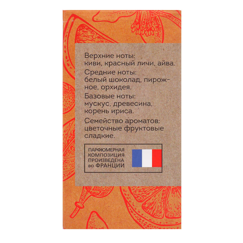 Аромат звучит очарованием и свежестью экзотических фруктов киви, личи и айвы в сочетании со сладостью шоколада. В шлейфе остается древесный пудровый аромат ириса и древесины.ВЕРХНИЕ НОТЫ: КИВИ, КРАСНЫЙ ЛИЧИ, АЙВА;НОТЫ СЕРДЦА: БЕЛЫЙ ШОКОЛАД, ПИРОЖНОЕ, ОРХИДЕЯ;НОТЫ БАЗЫ: МУСКУС,ДРЕВЕСИНА, КОРЕНЬ ИРИСА.